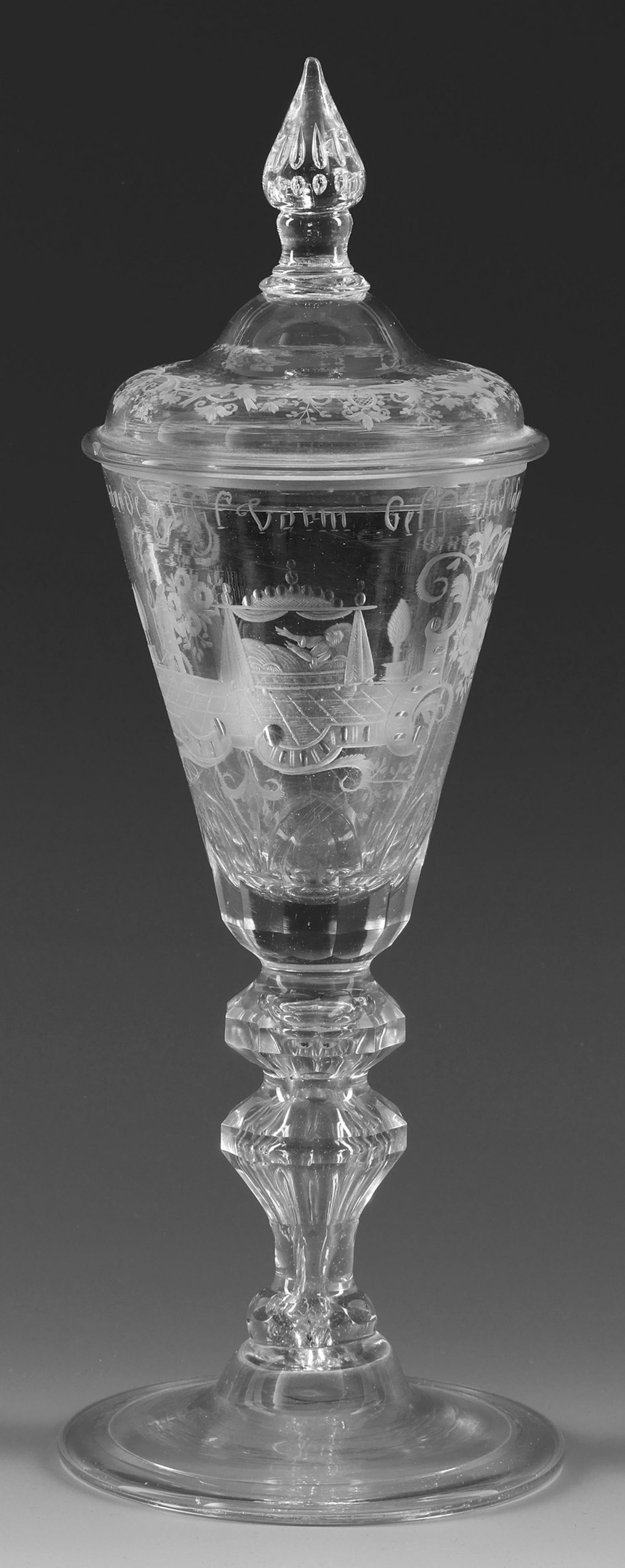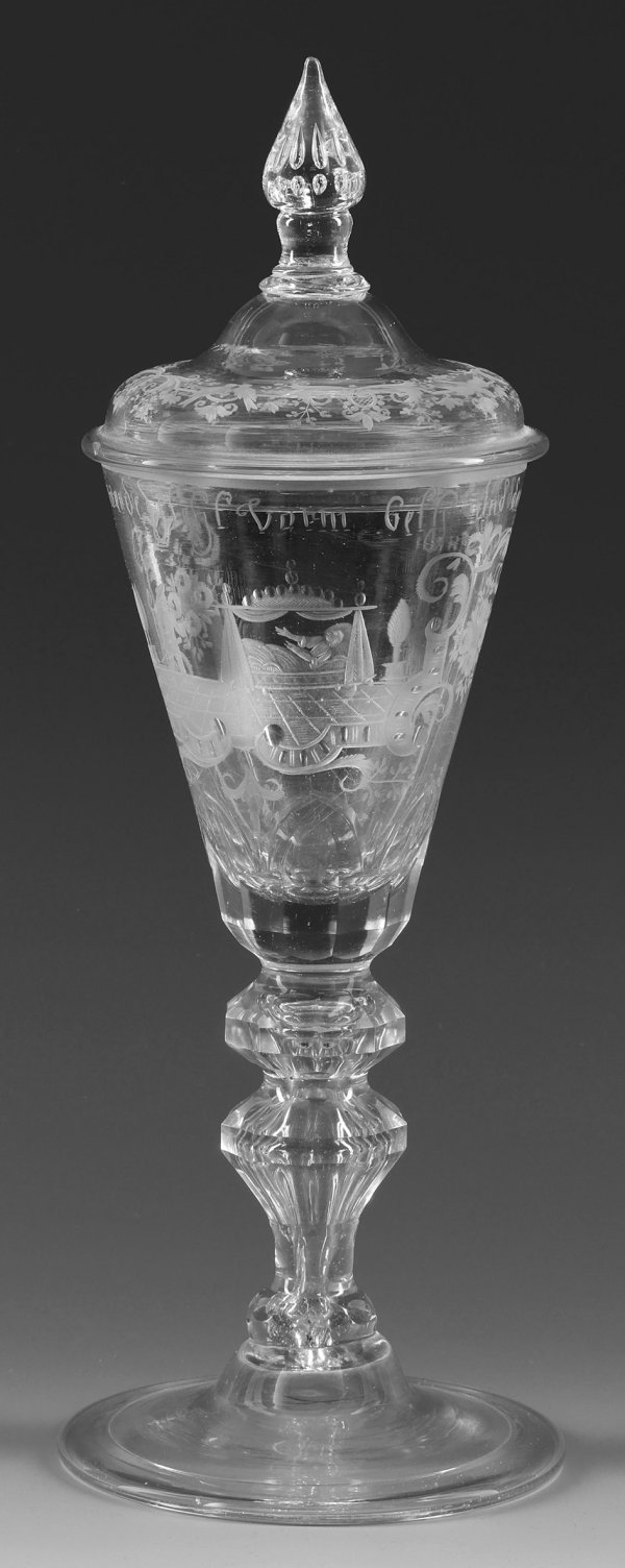 Farbloses Glas mit Abriss, partiell geschliffen. Konische Kuppa, geschälter Ansatz, facettierter Balusterschaft, mittig ansteigender Fuß mit umgeschlagenem Rand. Matt geschnittener, teilw. geblänkter Dekor. Schauseitig erotische Szene mit einem Herrn und einer vor ihm in einem Himmelbett liegenden Dame. Korrespondierender Sinnspruch im Dialekt: "das ist eine grosse pein werde steht vorm beth und darff nicht nein". Gewölbter Deckel, im tropfenförmigen Knauf kleine, eingestochene Luftblasen, am Rand eine umlaufende, geschnittene Bandelwerkbordüre mit Tauben und Taubenpaaren. Ges.-H. 33,2 cm.
