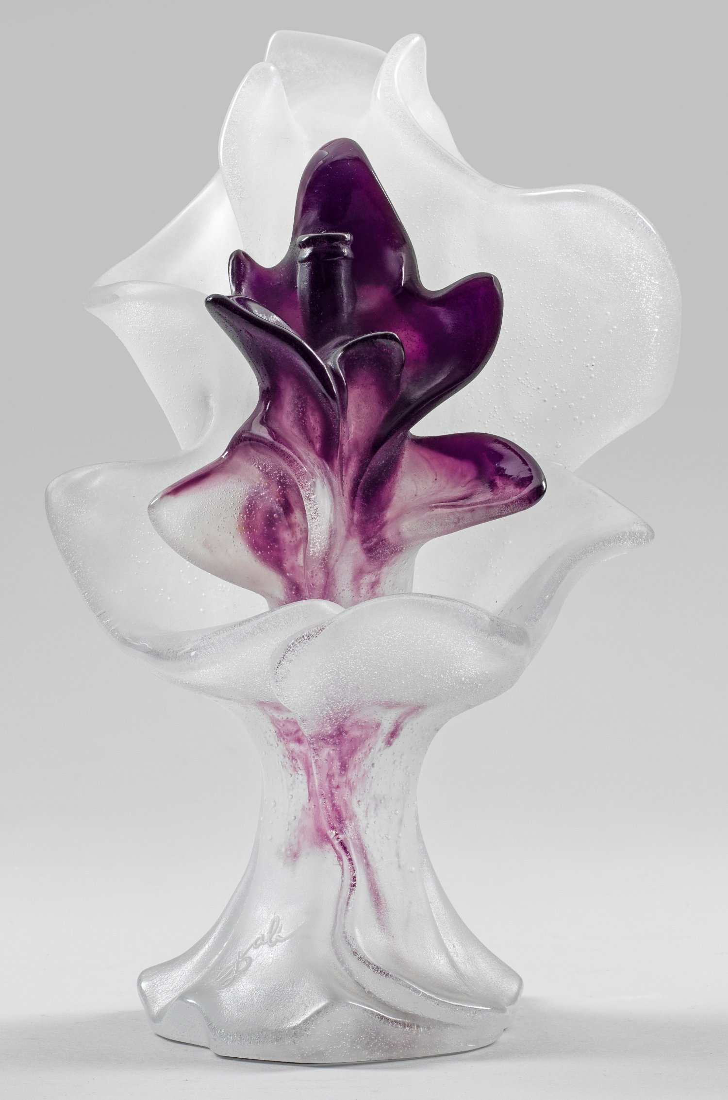 Pâte de verre (Pâte de cristal) aus farblosem und dunkel amethysthfarbenem, feinblasigem Glas, 1980. Künstler-Bez., Firmenmarke "DAUM (/) FRANCE", nummeriert 228/300. H. 46 cm.