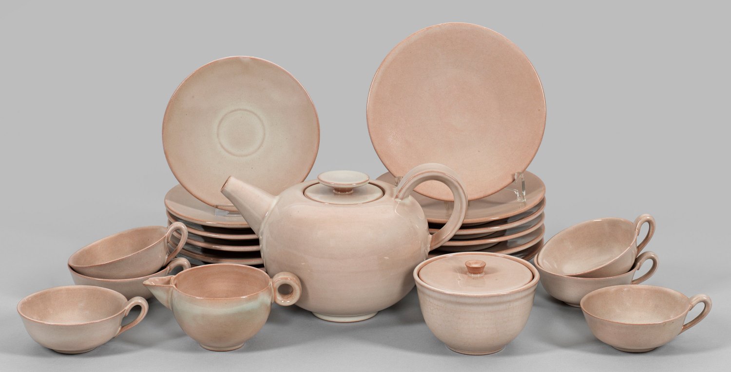 A 15-piece Karlsruhe glazed earthenware tea set designed by the Bauhaus potters Theodor Bogler and Otto Lindig. Mostly with factory marks.