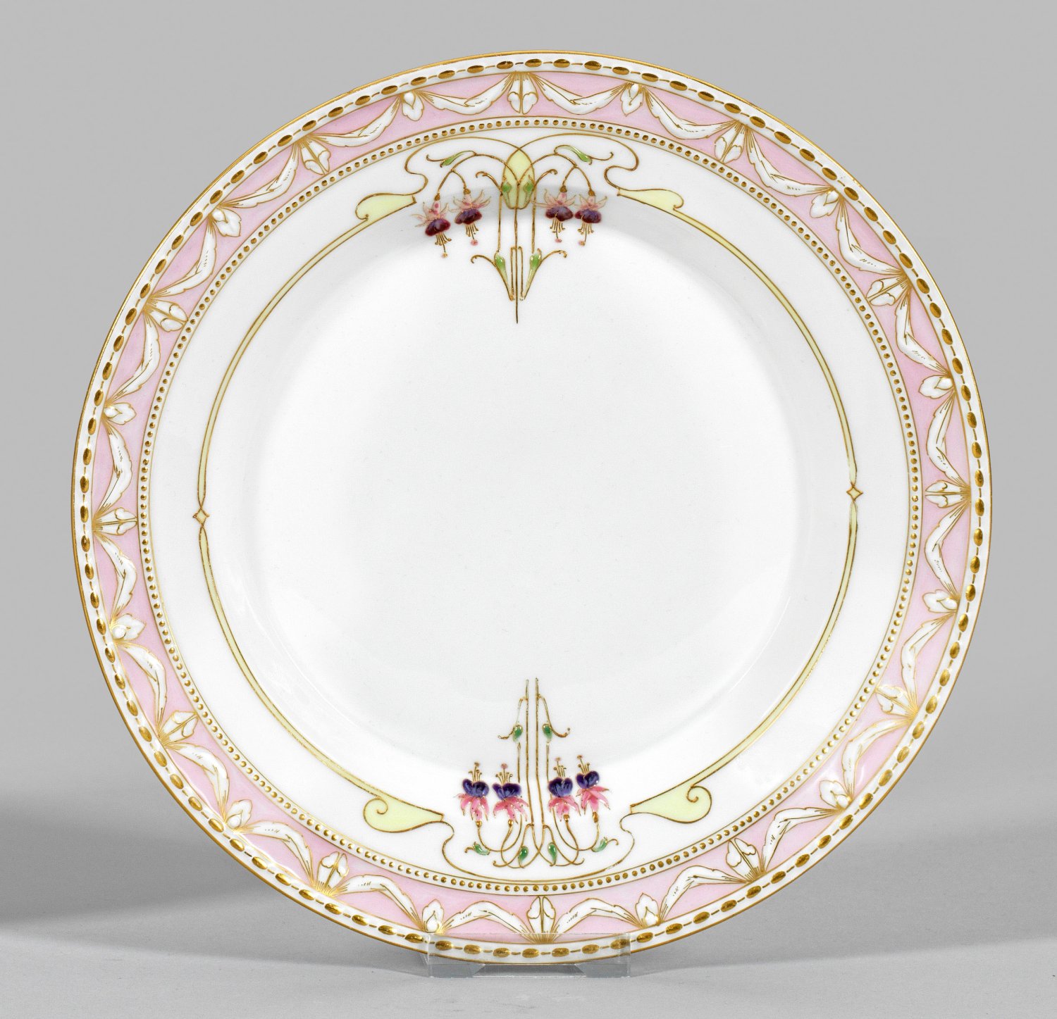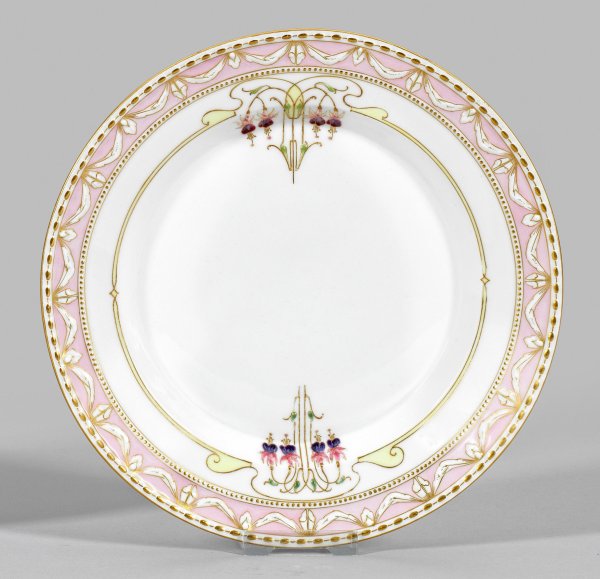 Runde, vertiefte Form. Reliefdekor "Kurland" auf rosafarbenem Fond. Übergehend vom Spiegel zur Fahne stilisierter, axialsymmetrisch angeordneter, feinliniger Floraldekor mit "Tränenden Herzen" aus farbigen Schmelzperlen und Reliefgoldlinien. Polychrome Aufglasur- und Emailmalerei. Goldstaffage. Maler-Nr. 73 für Karl Haube. Gold minim. ber.; Zepter- und Malereimarke. D. 25 cm.