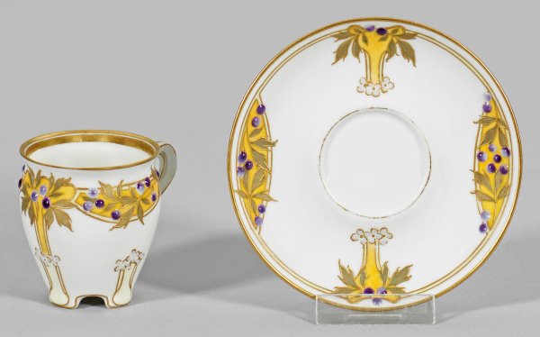 auf Untertasse. Auf vierfach eingezogenem Stand glockenbecherförmiger Korpus mit geschwungenem Henkel. Auf der Wandung und im Spiegel axialsymmetrischer Dekor. Feinlinig, in Reliefgold konturierte Beerenzweige und Vergissmeinnicht-Blüten aus lilafarbenen und blassbläulichen Emailperlen sowie sonnengelben Fondflächen. Polychrome Aufglasur- und Emailmalerei mit Goldstaffage. Dekor-Entw. Richard Fuhry, um 1902. Minim. ber.; Zepter- und Malereimarke. H. 5,5 cm.