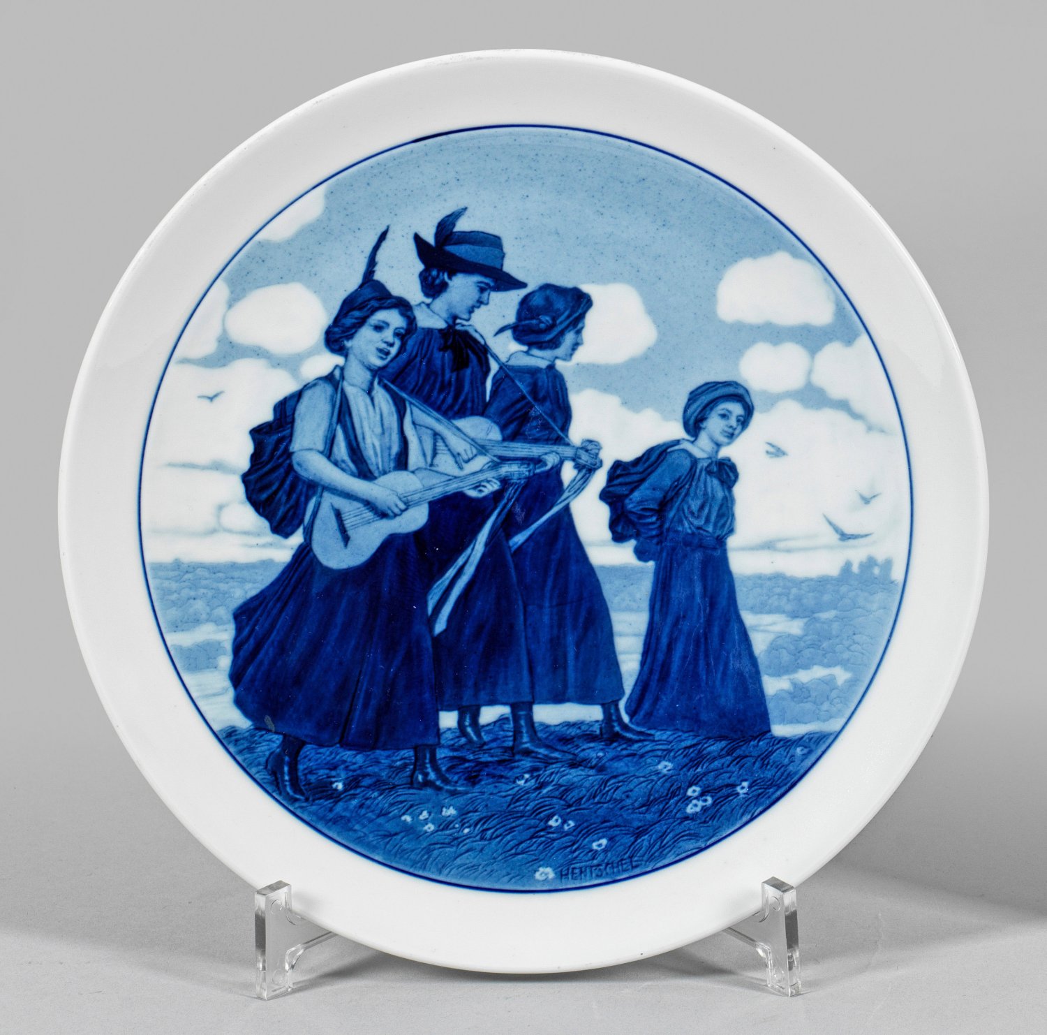 Runde Form. Im flach gemuldeten Spiegel konturierte Medaillonrahmung, darin szenische Darstellung von vier musizierenden Mädchen auf einer Wanderung in mehrfarbiger, unterglasurblauer Malerei. Dekor-Entw. wohl nach Rudolf Hentschel. Sign. "HENTSCHEL". Wandaufhängung. Schwertermarke. D. 25 cm.