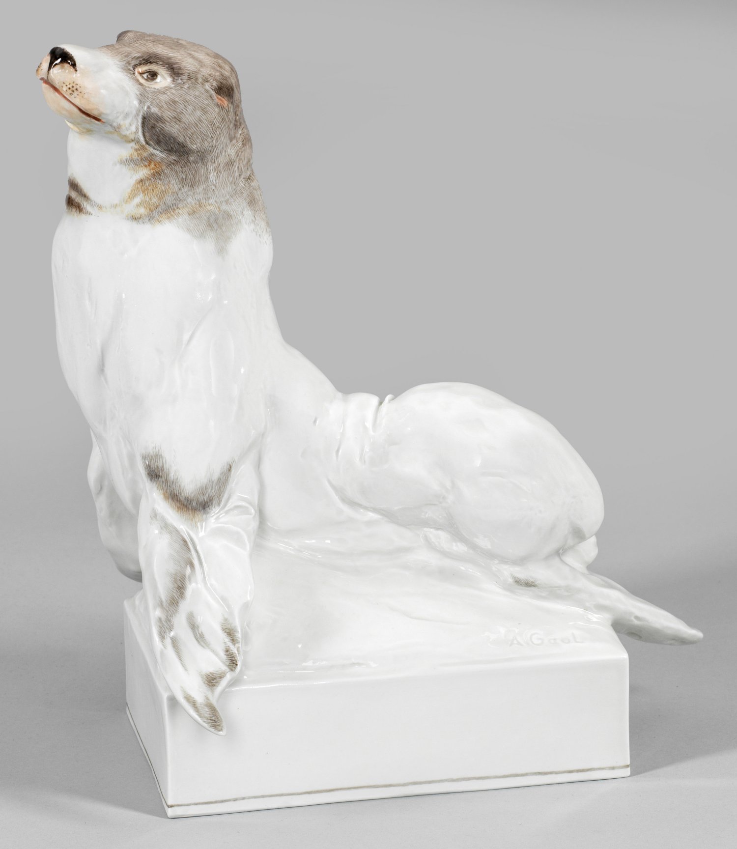 Rechteckiger Podestsockel. Über felsigem Terrain sitzender Seelöwe mit aufgerichtetem Kopf. Fein gestrichelte, angedeutete Fellzeichnung. Akzentuierte, polychrome Aufglasurmalerei. Entw. Prof. August Gaul. Entw.-Bez.; Modell-Nr. A 1026. Schwertermarke. H. 32 cm. 27 cm x 23 cm.