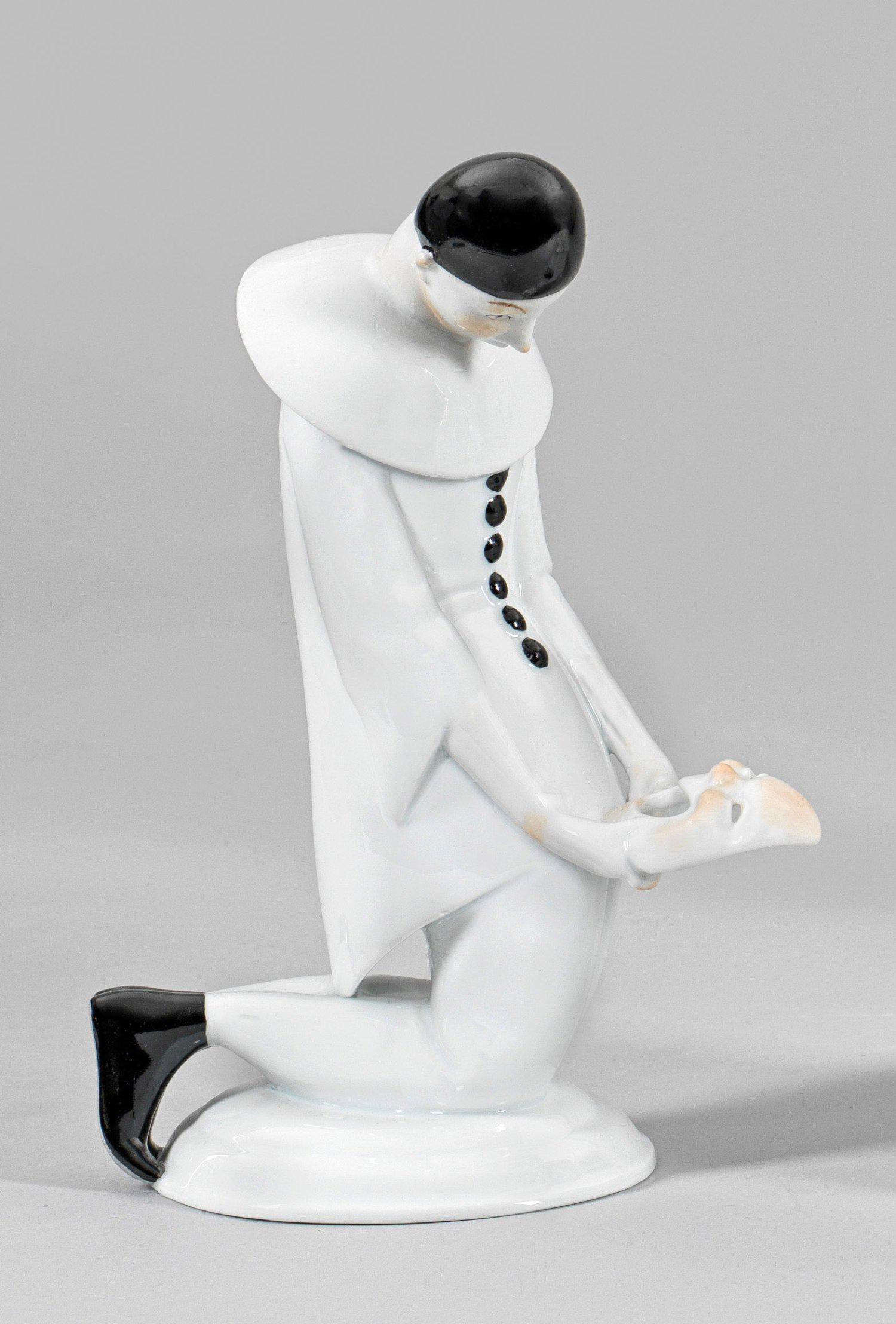 Neuausformung eines Art Déco-Modells der Schwarzburger Werkstätten. Auf rundem Sockel kniender Pierrot in typisch weißem Kostüm mit großer stilisierter Halskrause und schwarzer Kopfbedeckung, in den Händen eine Maske haltend. Sparsame polychrome Malerei. Entw. Karl Röhrig, um 1918/19. Modell-Nr. 212. Entw.-Bez.; Fuchs- und Manufakturmarke. H. 25 cm.