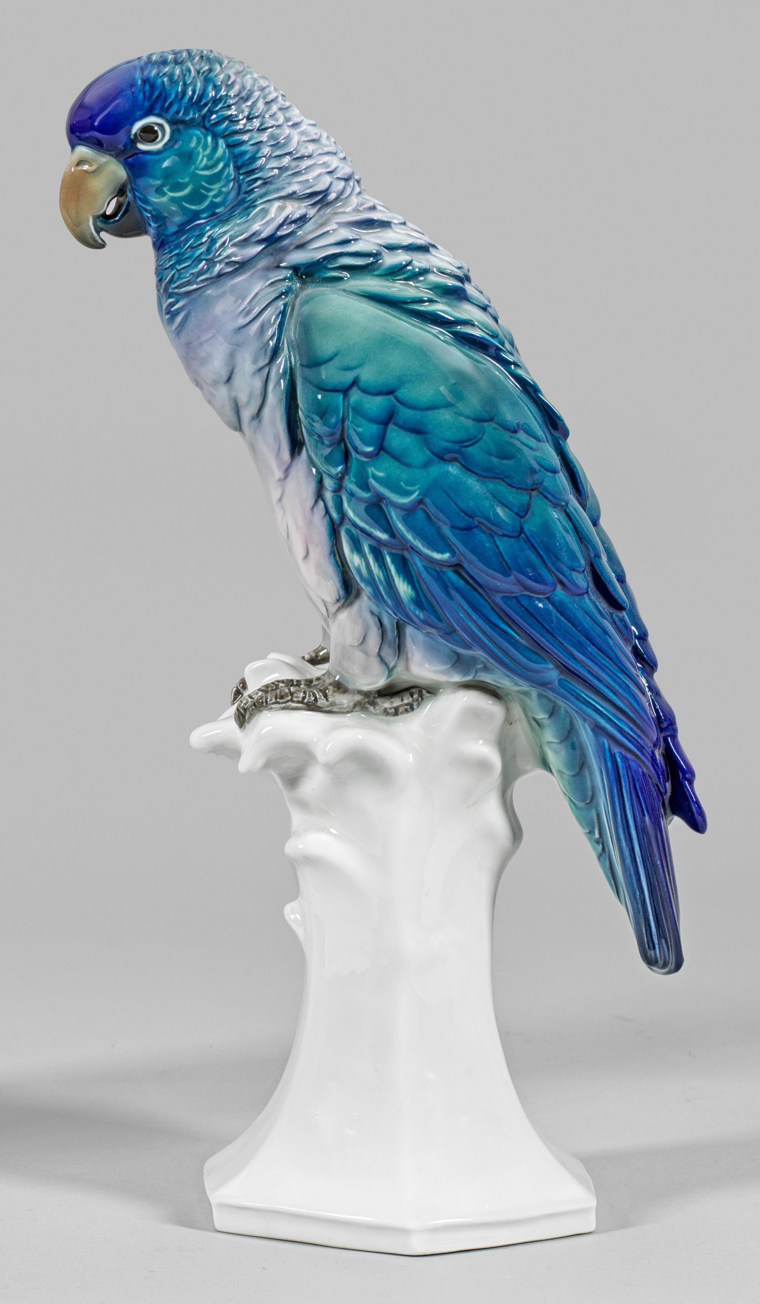 Auf hohem, sechseckigem Sockel sitzender Papagei mit farbenprächtigem Gefieder. Polychrome Unterglasurmalerei. Modell-Nr. 5731. Manufakturmarke. H. 44 cm.