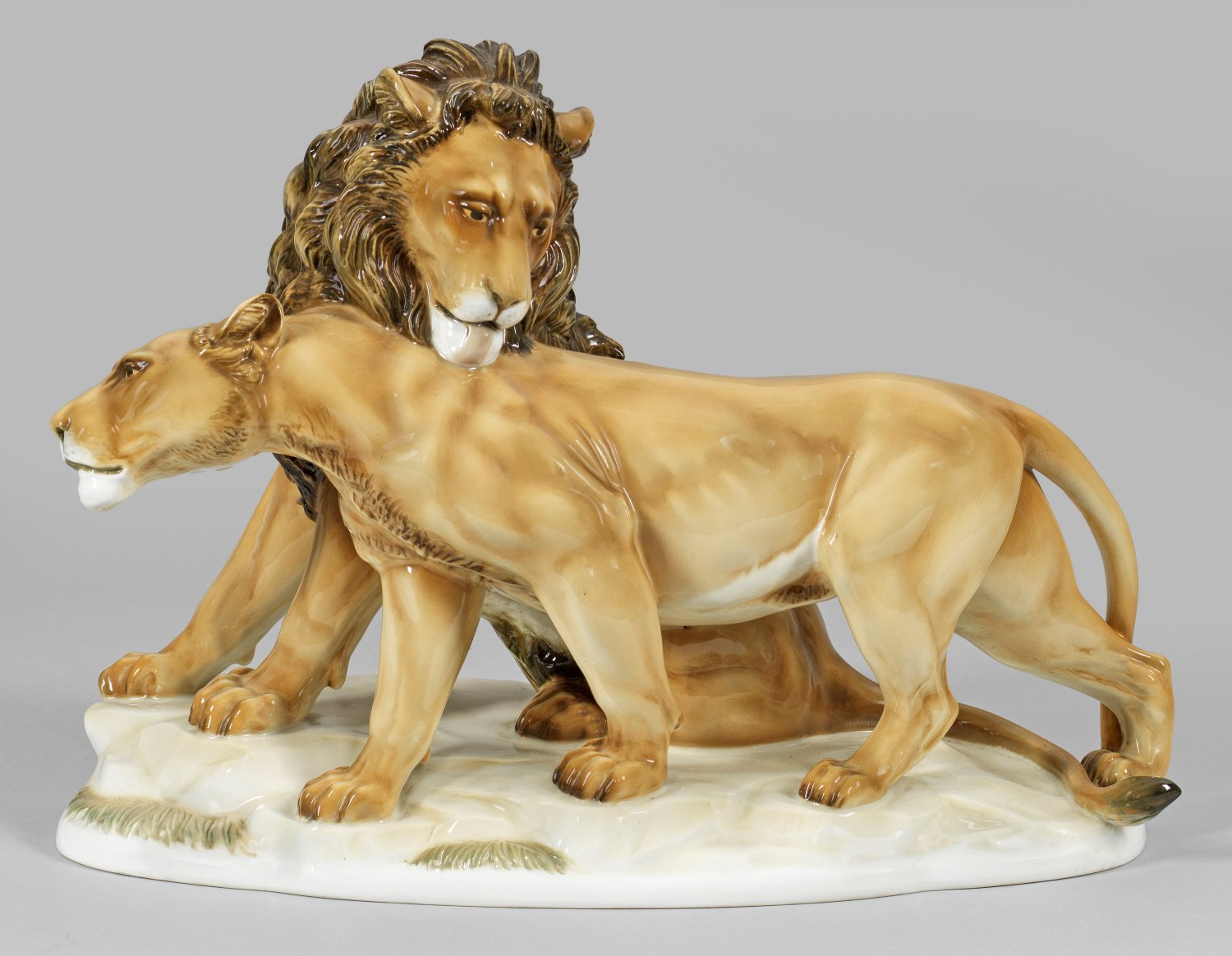 An Art Deco porcelain figure group of a lion couple. Insignificantly restored. Manufacturer's mark.
