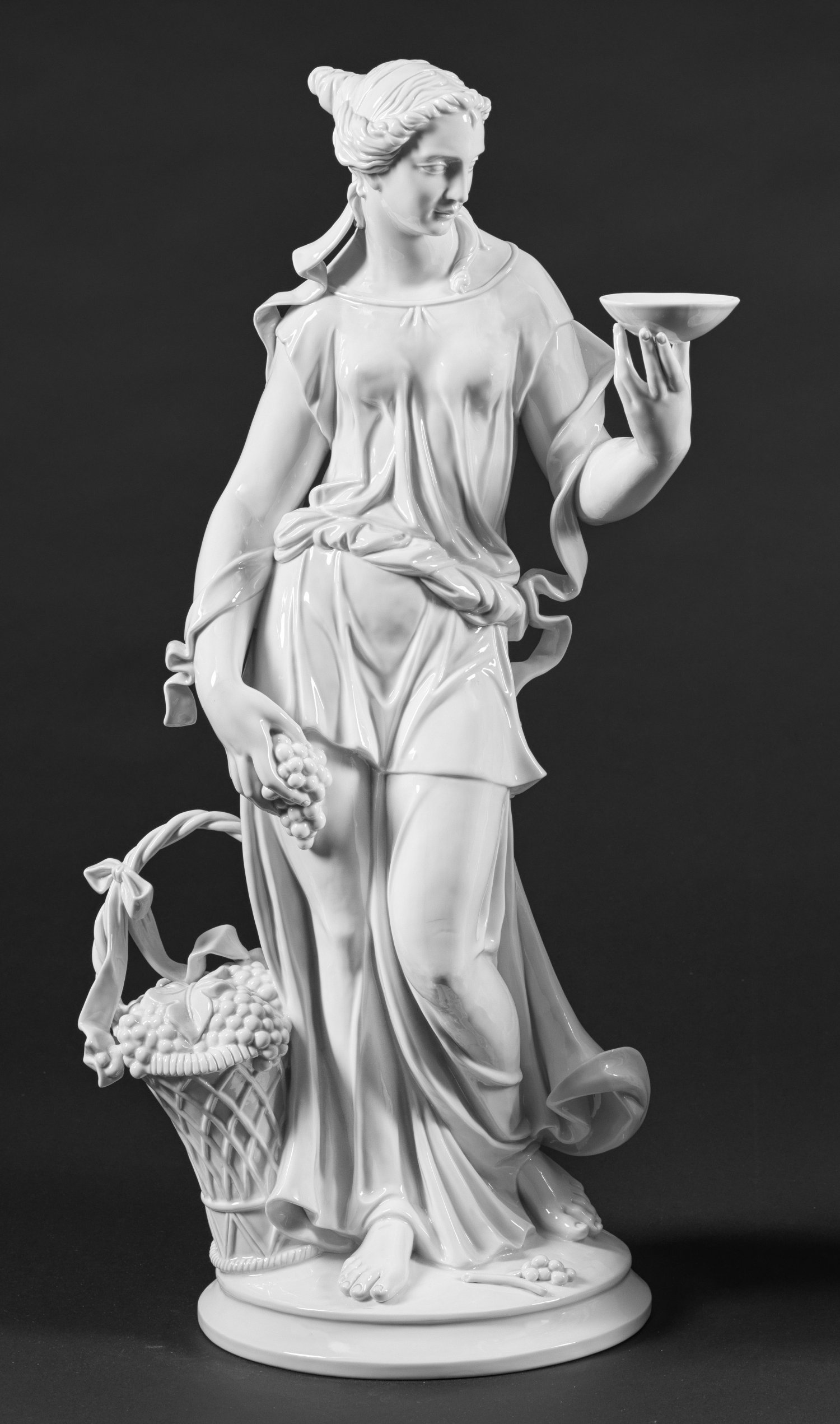 Weißporzellan. Auf ovalem, profiliertem Sockel, im Kontrapost stehende junge Frau in antikisierendem Gewand, den Kopf nach links gewandt, in den Händen eine Schale bzw. ein Traubenbündel haltend. Zu ihren Füßen stehender, mit Trauben gefüllter Henkelkorb. Entw. Gustav Oppel. Entw.-Bez.; Former-Bez. "Hollosi". Modell-Nr. 12454. Unterglasurblaue Manufakturmarke. H. 69 cm.