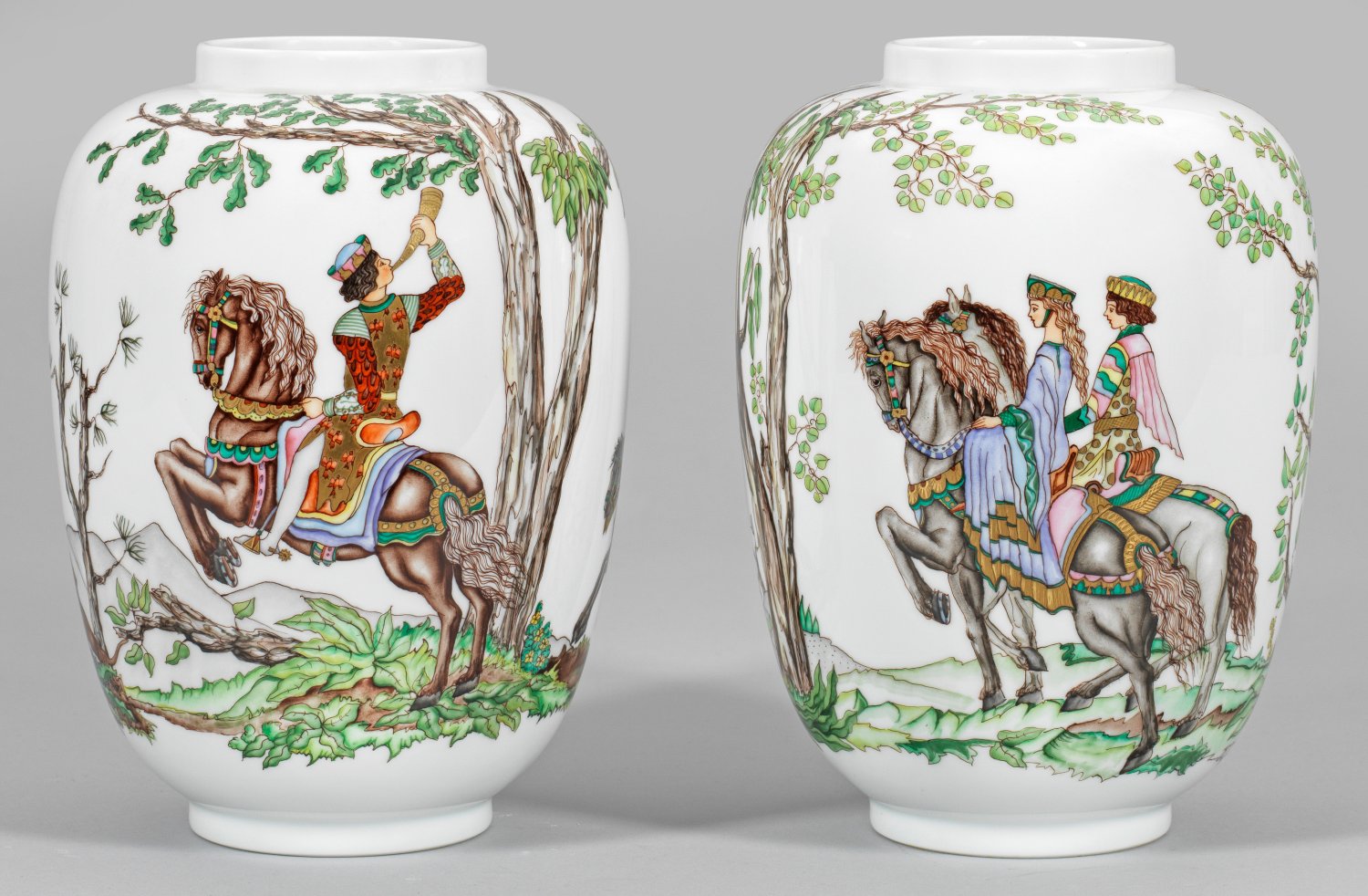 A pair of Vienna porcelain vases with decor "Falconry" designed by E. Rottenberg. Manufacturer's mark.