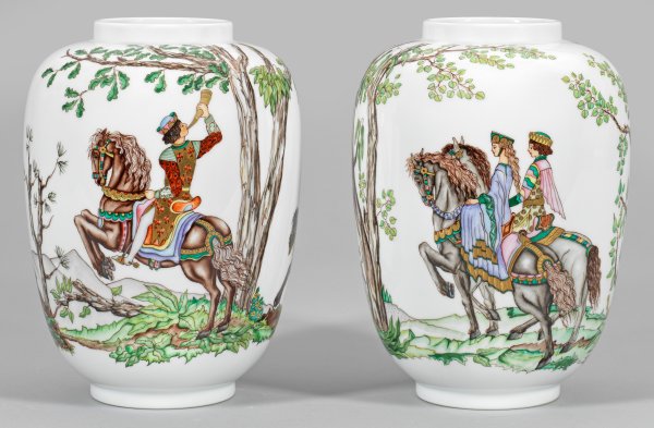 Balusterförmiger Korpus mit gerundeter Schulter und kurzem Hals. Auf der Wandung historisierende, szenische Darstellungen in polychromer Malerei mit Gold. Dekor-Entw. Emma Helena (Ena) Rottenberg. Modell- und Dekor-Nr. 114/4h-6142 und 114/4h-6143. Manufakturmarke. H. 28 cm.