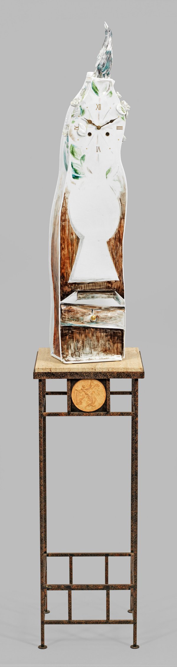 Hochgestreckter, balusterartig geschweifter Weißporzellan-Korpus, bekrönt von einem vollplastisch gearbeiteten Vogel. Die Schmalseiten mit plastisch aufgelegten Blüten und Blättern. Schauseitig angedeutetes, römisches Zifferblatt mit Goldzahlen sowie angebrachte Uhrenzeiger aus vergoldetem Metall. Unterhalb angedeuteter Schub. Sparsame, polychrome, lasierende Aufglasurmalerei mit Gold. Form- und Dekor-Entw. sowie Ausführung Peter Strang. Künstler-Sign. mit Dat. "P. Strang (19)96". Reliefiertes Künstler-Monogr. PS (Werkstattzeichen). Unikat-Nr. 488/1996. Uhrwerk mit Schlüsselaufzug sowie Schlagwerk auf Glocke. Beigabe: Verstrebter Metallpodest mit eingelassener, quadratischer Steinplatte und antikisierendem Reliefmedaillon aus Keramik. Schwertermarke. H. 94,5 cm. 19 cm x 14 cm.