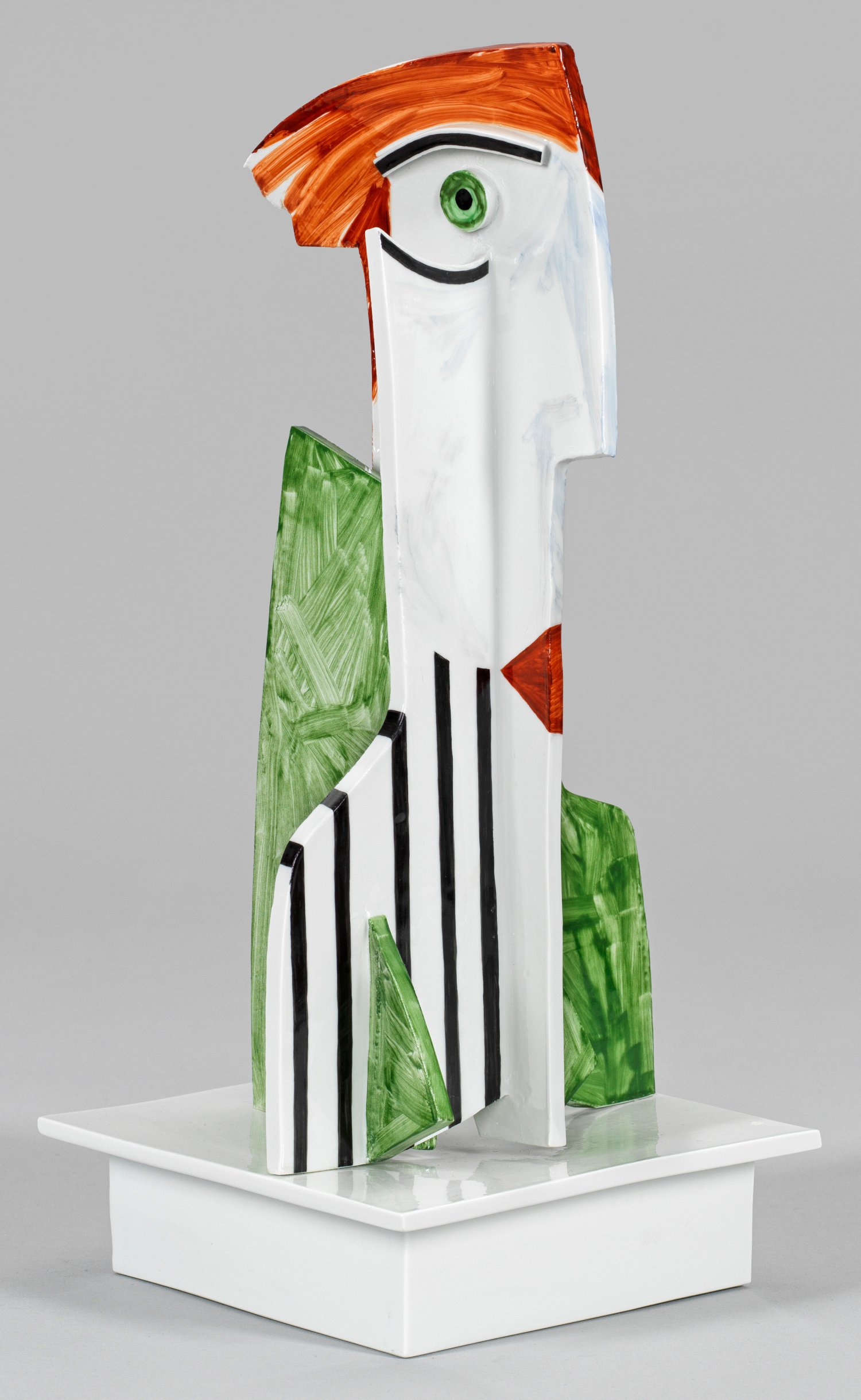 Atelierporzellan. Quadratischer Sockel mit überstehender Platte. Abstrahierte Kopfplastik aus längs- und quergesetzten, frei ausgeschnittenen sowie teilw. kantenrissigen, glasierten Porzellanplatten und Formelementen. Plastisch aufgesetzte Augen und eine Augenbraue. Farbenkräftige, teilw. lasierend mit breiten Pinselduktus ausgeführte, polychrome Aufglasurmalerei. Form- und Dekor-Entw. sowie Ausführung Olaf Fieber (geb. 1966 in Meißen). Künstler-Sign. mit Dat. "O. Fieber (19) '95". Geritzte Unikat-Nr. 131/1995. Etikett Meissen Museum, Sapporo, 2000. Schwertermarke. H. 39 cm. 17,5 cm x 18 cm.