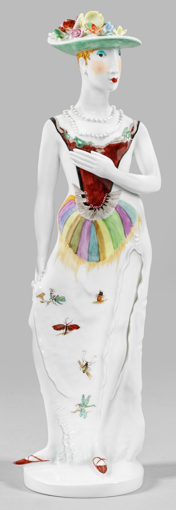 aus limitierter Atelierserie. Auf runder Plinthe stehende, elegant gekleidete, junge Frau, in leichtstoffigem, teilw. gerüschtem, ärmellosem Kleid, verziert mit unterschiedlichen, vereinzelten Insekten. Hals und Ohren mit aufgelegtem Perlenschmuck. Auf dem blonden Haar mit angedeuteten Locken, großer, extravaganter Hut mit plastischer Blumenzier. Dezente, farbkräftige Malerei. Entw. Silvia Klöde. Eingeritzte Unikat-Nr. "5/5/1999. Ligiertes Monogr. "KS". Modell-Nr. 90561. Schwertermarke mit Zusatz "A" für Künstleratelierserie. H. 36,5 cm.