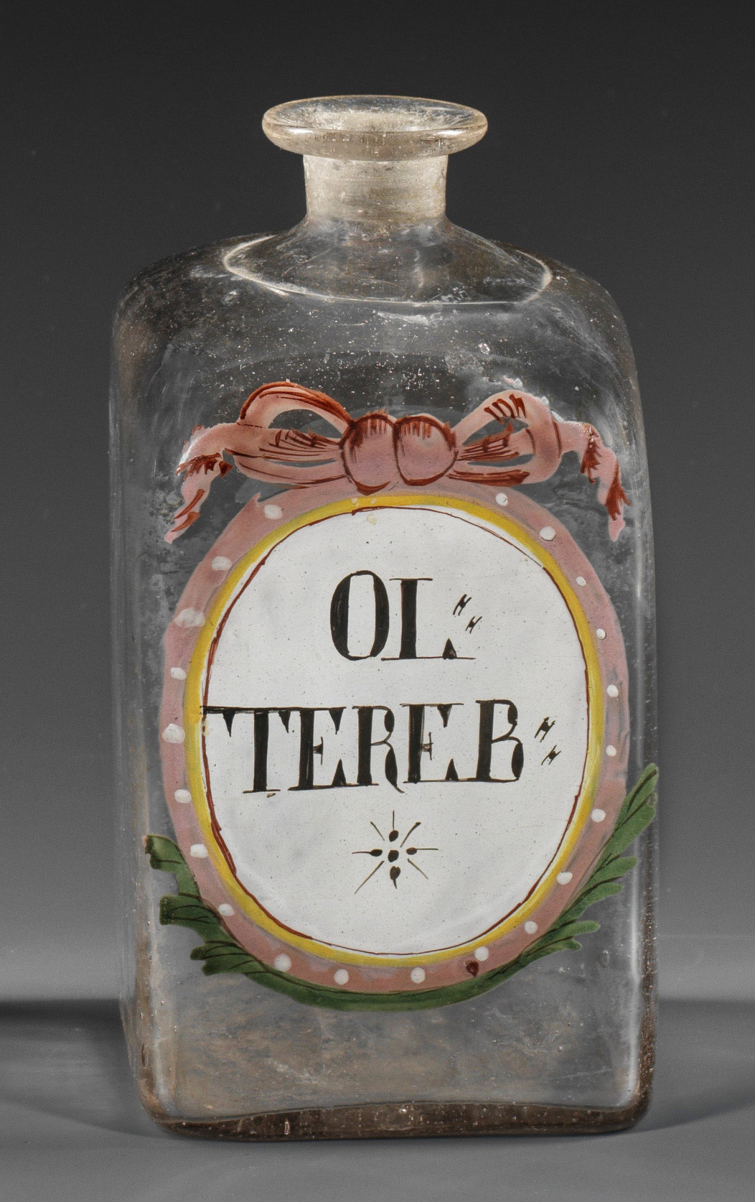 Farbloses, leicht graustichiges Glas. Vierkantflasche mit quadratischem Querschnitt und gerundeter Schulter. Schauseitig Dekor in Emailmalerei: ovales, weißes, gelb eingefasstes Schild in rosafarbener, weiß gepunkteter Rahmung mit Schleifenbekrönung, unterhalb grüne Blatt- bzw. Palmzweige, Inschrift in Schwarz "OL: TEREB:", begleitet von einem Keulenstern als Ornamentmotiv. H. 16,3 cm.