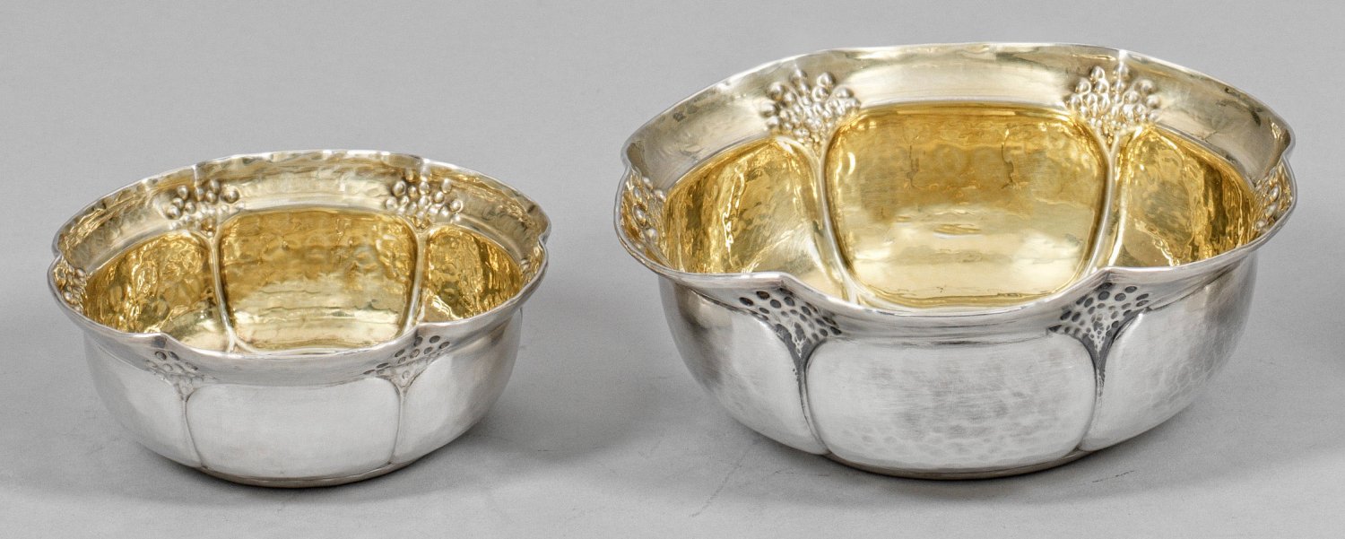 Sterlingsilber. Runder, flacher Stand, übergehend in sechspassig gebuckelte, sich erweiternde Wandung, flächendeckend mit Hammerschlagdekor verziert. Ausgestellter, blütenförmig geschweifter Rand mit Punktedekor. Innen vergoldet. Gest. 925, Beschauzeichen, Herstellerzeichen sowie -nummer "176". Gew. zus. ca. 335 g. H. 4,5 cm - 5,5 cm. D. 11 cm - 15 cm.