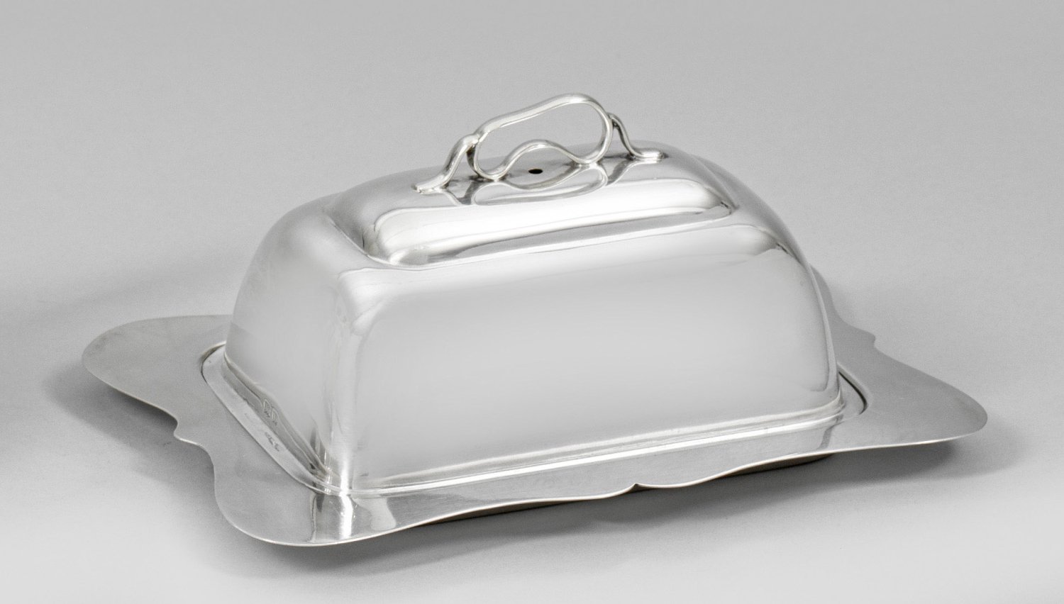 Sterlingsilber. Rechteckige, glatte Form mit gerundeten Ecken und passig geschweiftem, breitem Rand. Gering vertiefter Spiegel mit passigem Glaseinsatz. Haubenförmiger, profilierter Deckel mit durchbrochen gestaltetem, filigranem Henkel. Minim. best.; Gest. 925, Beschaumarken, Herstellerzeichen, Jahresbuchstabe "D". Gew. ohne Glaseinsatz 355 g. H. 8 cm. 19,5 cm x 13,5 cm.