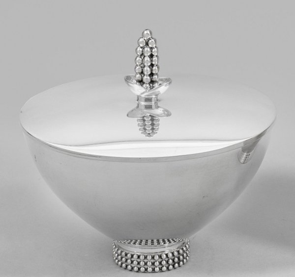 Sterlingsilber. Zylindrischer Stand, dreireihig umzogen von reliefplastischem Perlband, übergehend in hoch aufschwingende, gebauchte, glatte Schale. Gering gebogter Steckdeckel, zentral bekrönt von plastisch gearbeitetem, stilisiertem Knospenknauf, bestehend aus korrespondierend aneinandergereihten Perlen. Gest. 925, Herstellerzeichen, Modell-Nr. 10. Gew. ca. 405 g. H. 12,5 cm. D. 13 cm.