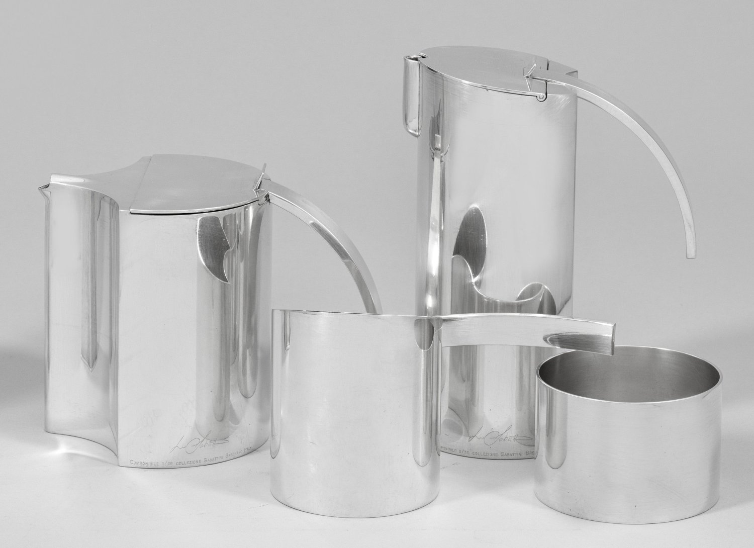 Messing, versilbert. 4-tlg.; Teekanne, Kaffeekanne, Milchgießer und Zuckerschale. Puristisch glatte, gerundete sowie gekantete Formen, teilw. puzzleähnlich durch passige Mulden nahezu miteinander verschmelzend zusammenstellbar. Entwurf von 1971. H. 5,7 cm - 18,5 cm.