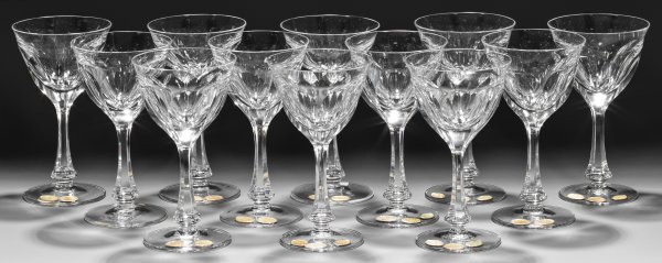 Farbloses Kristallglas, geschliffen. Flacher Scheibenfuß, Schaft und glockenförmige Kuppa sechsfach facettiert. Entw. 1934. Jeweils Firmen-Ätzstempel "Moser" oder "M", elf Gläser mit Firmen-Etikett sowie Etiketten mit Bez. "FIRST QUALITY" und "MADE IN CZECHOSLOVAKIA; sechs mit Firmen-Ätzstempel "M". H. 14 cm.