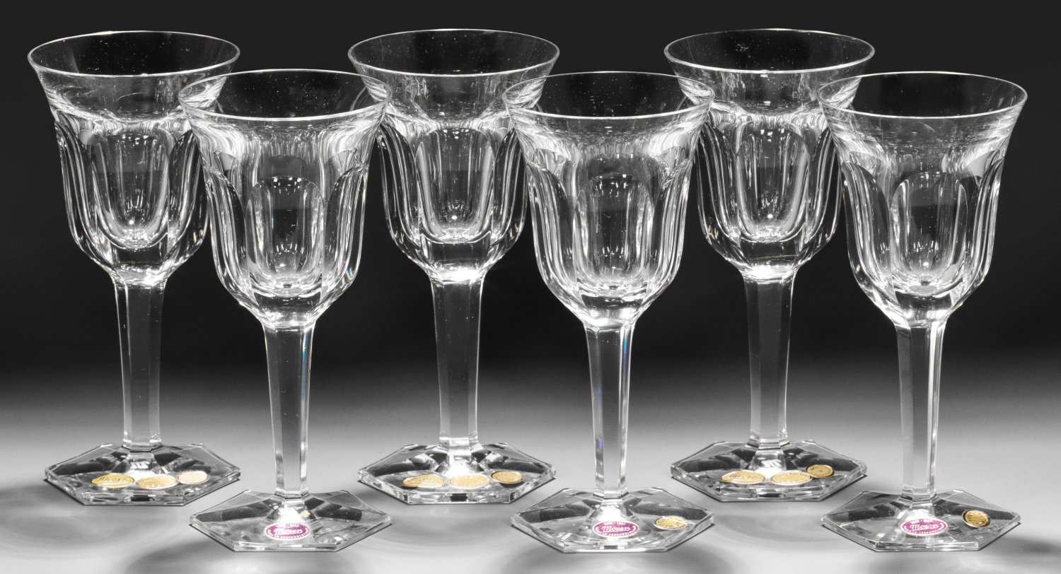 A set of six Moser "Pope" cut crystal white wine glass. Each with acid factory mark and factory label, three glasses with 100 year anniversary Moser factory label (1857-1957).