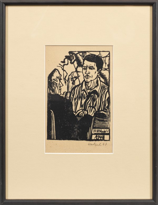 Holzschnitt/Velin, 1947. Sign. u. dat. (19)47; im Druckstock dat. 1948. Wvz. Dube H383, Ebner/Gabelmann 897 H. Von Heckel nur an Freunde und Sammler gegebenes 17. "Jahresblatt", der 1930 mit dem Brauch begann, zum Jahreswechsel eine druckgrafische Arbeit (meist ein kleiner Holzschnitt) mit symbolischer Botschaft an seine Freunde zu verschicken. Bis 1968 entstanden so 38 dieser "Jahresblätter". Darstellung 15,1 x 10,8 cm. Rahmen.