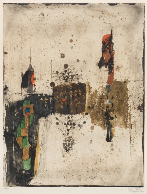 Vier Farbradierungen und eine Farblithographie/Velin. Jeweils sign.; Eine Radierung bez. "E. A.", zwei Radierungen mit Trockenstempel L'OEUVRE GRAVÉE" und nummeriert 83/95, 10/95, eine weitere nummeriert 16/50; die Farblithographie mit Trockenstempel "manus presse", nummeriert 57/95. Darstellung bzw. Plattenmaß 49,5 cm-76,5 cm x 32 cm-56 cm. Rahmen.