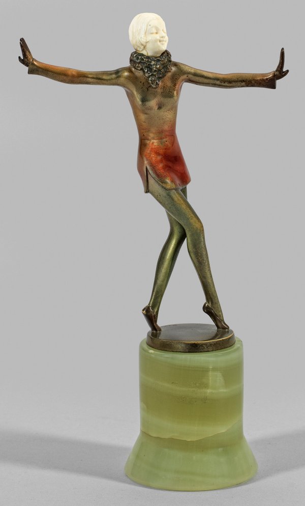 Bronze, goldfarbene und rote Kaltpatinierung; Elfenbein, geschnitzt. Hellgrüner Onyxsockel. Sign. "Renz". Vollplastische Darstellung einer jungen, schlanken Tänzerin mit sog. "Bubikopf" in kurzem Kleid, die ganz in den Tanz versunken ist, mit überkreuzten Beinen auf den Fußspitzen stehend und die Arme graziös erhoben. Motiv- und stiltypische Art Déco-Statuette Lorenzls, der zu den bedeutendsten Wiener Bildhauern der Zwischenkriegszeit gehört. Charakteristisch für ihn sind stilisierte, in den Proportionen ausdrucksvoll überlängte Figuren eleganter Tänzerinnen. Untere Sockelkante best.; Ges.-H. 21,2 cm.