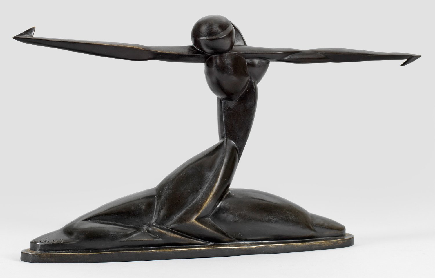 Bronze, dunkel patiniert. Bez.; Posthumer, zeitgenössischer Guss, Ende 20./Anfang 21. Jh., nach der um 1920 geschaffenen, kubistischen Bronze des Bildhauers. 1915 stellte Herzog erstmals in Herwarth Waldens "Sturm-Galerie" in Berlin aus und gehörte danach zu dessen favorisierten Bildhauern - 1919 zählte er ihn neben Alexander Archipenko und William Wauer zu den bedeutendsten Bildhauern. Nach dem I. Weltkrieg schloss sich Herzog der Novembergruppe an, 1919-1933 war er regelmäßig in der Großen Berliner Kunstausstellung vertreten, mehrfach auch in den Ausstellungen der Akademie der Künste. Nach 1933 gehörte Herzog zu den von den Nationalsozialisten als "entartet" verfemten Künstlern. H. 36,5 cm.