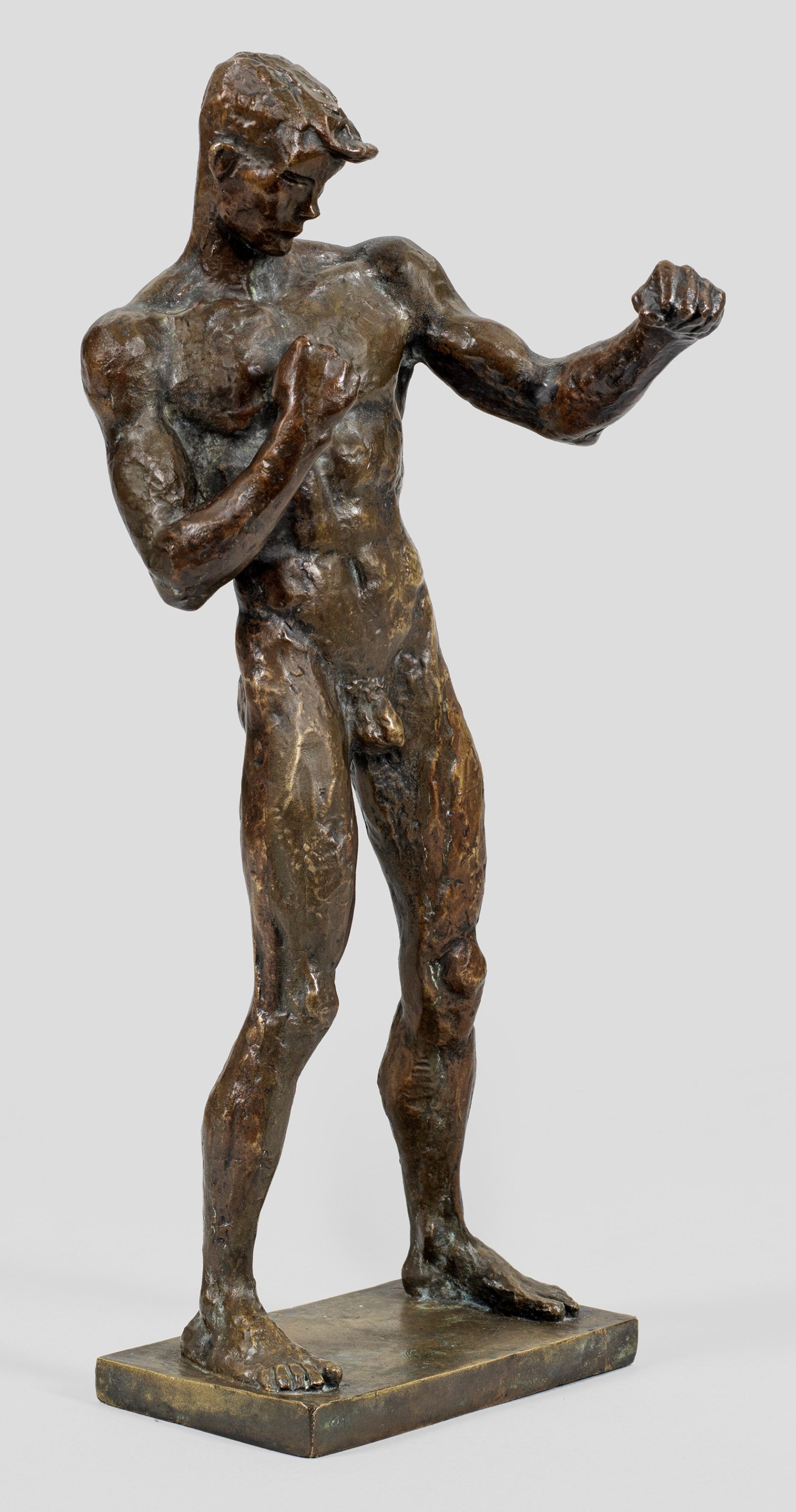 Bronze, in Brauntönen patiniert, 1925. Gießerstempel "H NOACK (/) BERLIN-FRIEDENAU". Wvz. Diehl (1927) Nr. 50, Crevel (1930), Nr. 50; Buhlmann (1987) Nr. 47, Berger/Ladwig (2013) Nr. 070. Auf einer rechteckigen Plinthe stehender junger Boxer in Kampfpose als Aktfigur. Sintenis, die heute vor allem durch Tierbronzen bekannt ist, hat sich 1925-1933 mehrfach mit dem Thema des Sportlers und insbesondere des Boxers befasst. Ihre 1925 geschaffene Bronzeplastik mit dem lebhaft modellierten, jugendlich schönen Körper des seinerzeit bekannten Mittelgewichtboxers Erich Brandl war die erste, es folgten Darstellungen der Boxer Helmuth Hartkopp (1930) und Paul Wallner (1933). 1926 zeigte Sintenis die Bronzeplastik von Brandl in der Herbstausstellung der Berliner Secession (Kat.-Nr. 199), im selben Jahr in der großen Ausstellung "Kunst u. Sport, Kunst u. Leibesübungen" in Düsseldorf, 1929 folgte die internationale Ausstellung "Der schöne Mensch in der neuen Kunst" in Darmstadt; die maßgebliche Kunstzeitschrift "Deutsche Kunst und Dekoration" bildete ein Stucco-Exemplar ab (Bd. 59, 1926/27). Hierdurch wurde die Statuette einem weiten, sowohl an Kunst als auch Sport interessierten Publikum bekannt. H. 40,7 cm.