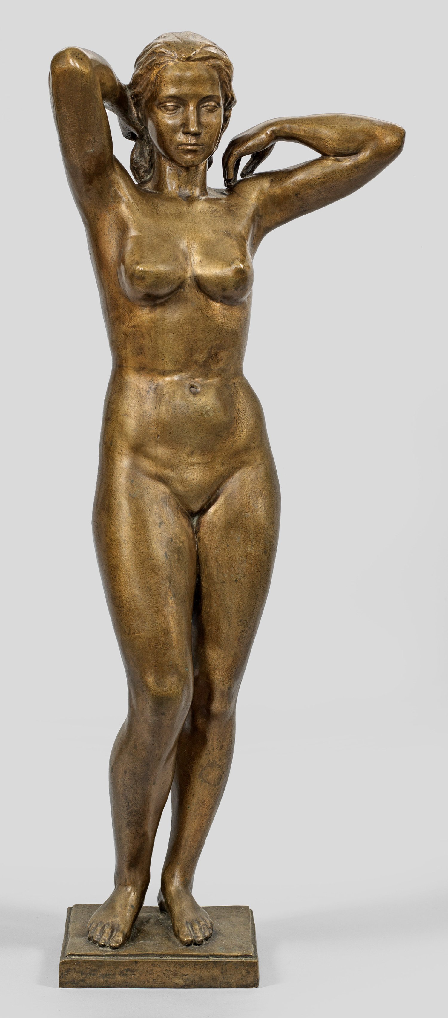 Bronze, goldbraun patiniert, Sign.; Auf einer rechteckigen Plinthe im Kontrapost stehender weiblicher Akt mit zur Schulter und zum Haar erhobenenen Armen. In der 2. Hälfte der 1930er Jahre entstandene Bronze. Abel studierte 1921-1923 an der Badischen Landeskunstschule Karlsruhe, 1923-1928 an den Vereinigten Staatsschulen in Berlin bei Kurt Kluge und als Meisterschüler für Bildhauerei bei Wilhelm Gerstel. Seit 1926 hatte Abel ein eigenes Atelier in Berlin, 1929 wurde er Stipendiat der Preußischen Akademie der Künste für die Deutsche Akademie Rom Villa Massimo, es folgten Studienaufenhalte in Paris. Abel gehörte ab 1933 zur Ateliergemeinschaft Klosterstraße, in der bekannte Künstlerkollegen wie Hermann Blumenthal, Käthe Kollwitz, Gerhard Marcks und Richard Scheibe wirkten. 1939/40 erhielt er ein weiteres Stipendium für die Deutsche Akademie Rom Villa Massimo. 1938-1944 war Abel mehrfach in der Großen Deutschen Kunstaustellung in München vertreten, vornehmlich mit weiblichen Aktstatuen. 1945 wurde er zum Volkssturm eingezogen und gilt seit April 1945 als vermisst. H. 100 cm.