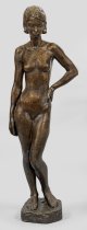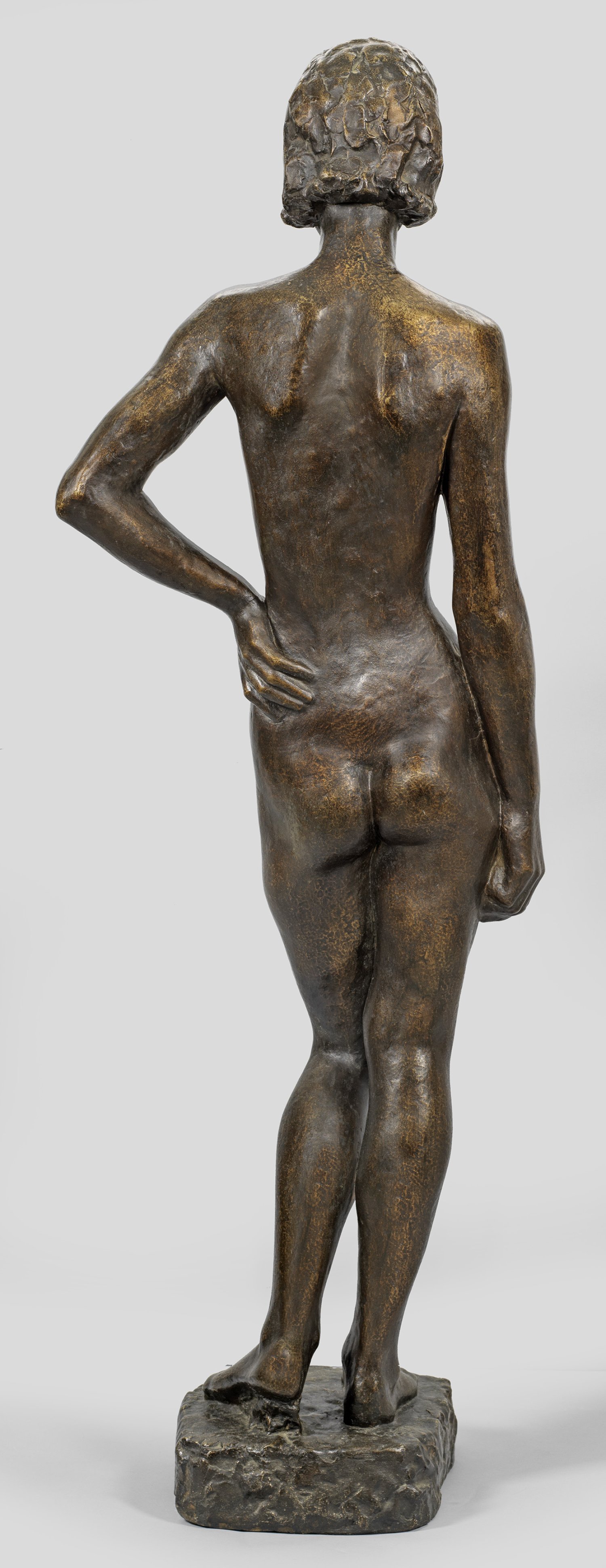 Bronze, in nuancierten Brauntönen patiniert. Sign.; Auf einer unregemäßigen Plinthe im Kontrapost stehender Akt eines Mädchens bzw. einer jungen Frau mit an die linke Hüfte gestütztem Arm. Ende der 1930er Jahre entstandene Bronze der Klassischen Moderne. Robert Stieler war Meisterschüler von Fritz Klimsch und anschließend von Richard Scheibe an der Preußischen Akademie der Künste. Seine künstlerisch erfolgreichste Zeit hatte Stieler in den 1930er Jahren. 1935 gewann er den Großen Staatspreis der Akademie der Künste und wurde in der Fachliteratur als vielversprechendes Talent einer neuen Bildhauergeneration gewürdigt; 1935/36 hatte er seinen Stipendiaten-Aufenthalt in der Villa Massimo in Rom. H. 120 cm.