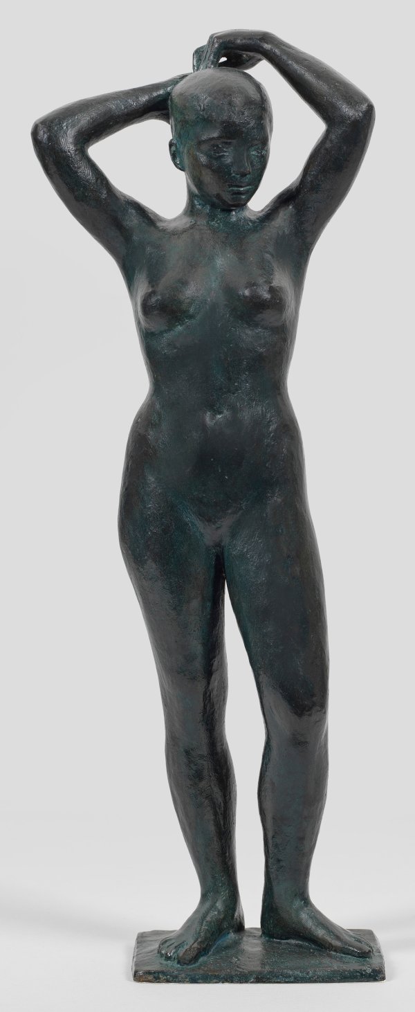 Bronze, dunkel patiniert. Sign. u. nummeriert 5/8; Stempel der Gießerei Cappelle. Auf einer rechteckigen Plinthe stehender Akt einer jungen Frau mit über den Kopf erhobenen Armen. Formal auf das Wesentliche reduzierte Plastik in der Tradition der französischen Klassischen Moderne, insbesondere Aristide Maillol. Naudet studierte Bildhauerei bei Marcel Gimond an der École des Beaux-Arts in Paris. Seit 1959 lehrte sie als Professorin, später war sie Präsidentin der Société des artistes français in der Sektion für Bildhauerei. H. 80 cm.