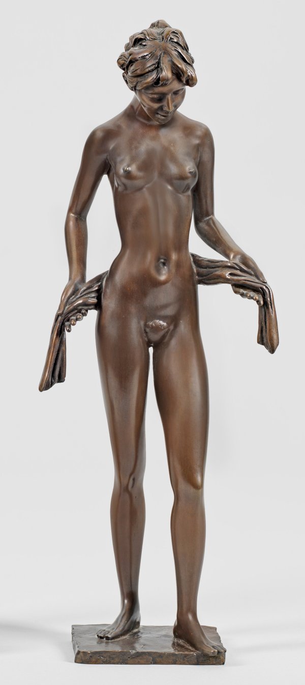 Bronze, dunkelbraun patiniert, 1981. Ligatur-Monogramm, nummeriert 108/450, Gießerstempel 'H & G'. Schinzel studierte an der Akademie der Bildenden Künste in Berlin, u. a. als Meisterschüler bei Richard Scheibe und Arno Breker, ab 1945 war er freischaffender Bildhauer in Augsburg, seit 1991 in Waldbronn. H. 43,5 cm.