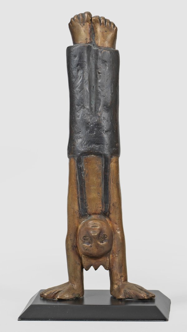 Bronze, goldbraun und dunkel patiniert. Monogr.; Schwarz gefasste MDF-Plinthe. Die unbekümmerte Lebensfreude zum Ausdruck bringende Plastik mit dem Perspektivwechsel des kleinen Königs, welcher der Schwerkraft trotzt, ist repräsentativ für das Oeuvre Suhrs. In ihren formal reduzierten Bronzen schildert sie mit Empathie Kinder und deren Leben. 1992-1999 studierte Suhr an der Hochschule für Künste in Bremen bei Prof. Bernd Altenstein, 1998/99 als Meisterschülerin. Ges.-H. 36,8 cm.
