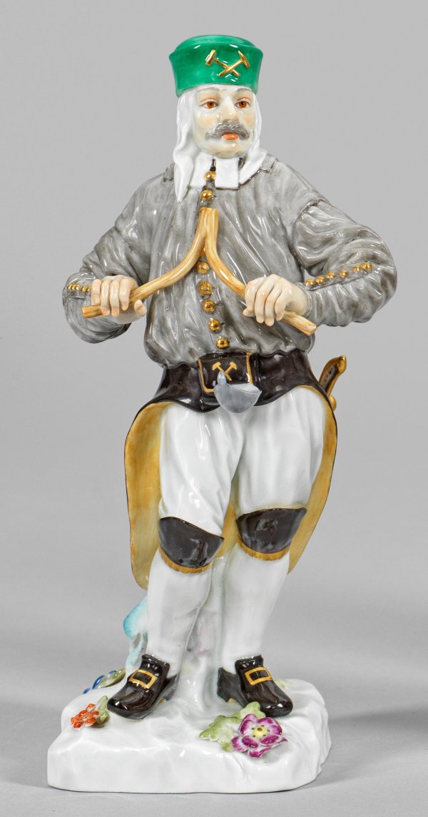 Auf einem blumenbelegten Felssockel stehender Obersteiger in berufstypischer Kleidung, mit beiden Händen eine Wünschelrute haltend. Polychrome Malerei mit Gold. Entw. Johann Joachim Kaendler und Peter Reinicke. Modell-Nr. 69511. Unw. rest.; Schwertermarke. H. 20,5 cm.