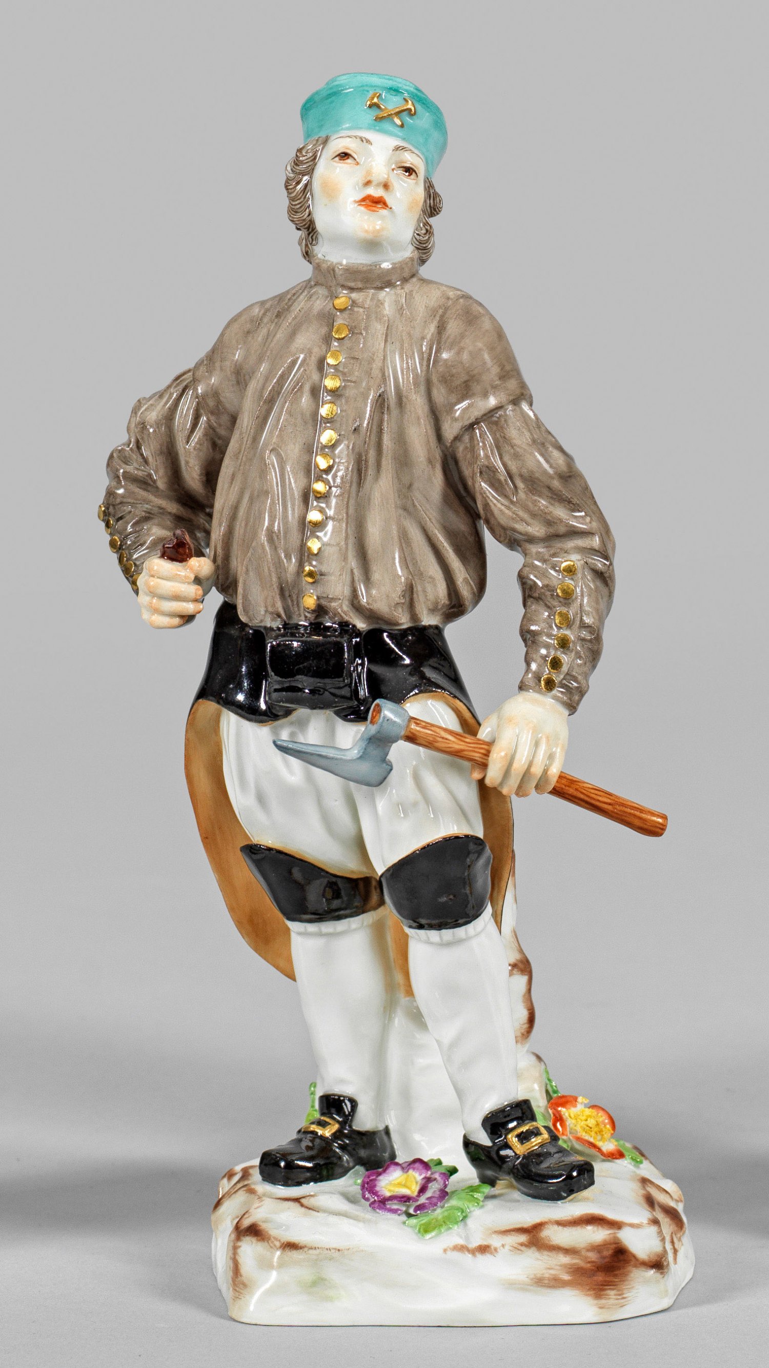 Auf einem blumenbelegten Felssockel stehender Bergmann in berufstypischer Kleidung mit seegrüner Kappe, in der rechten Hand einen Schlägel, in der Linken einen Häckel haltend. Polychrome Malerei mit Gold. Entw. Johann Joachim Kaendler und Peter Reinicke. Modell-Nr. 1309. Schwertermarke. H. 20,5 cm.