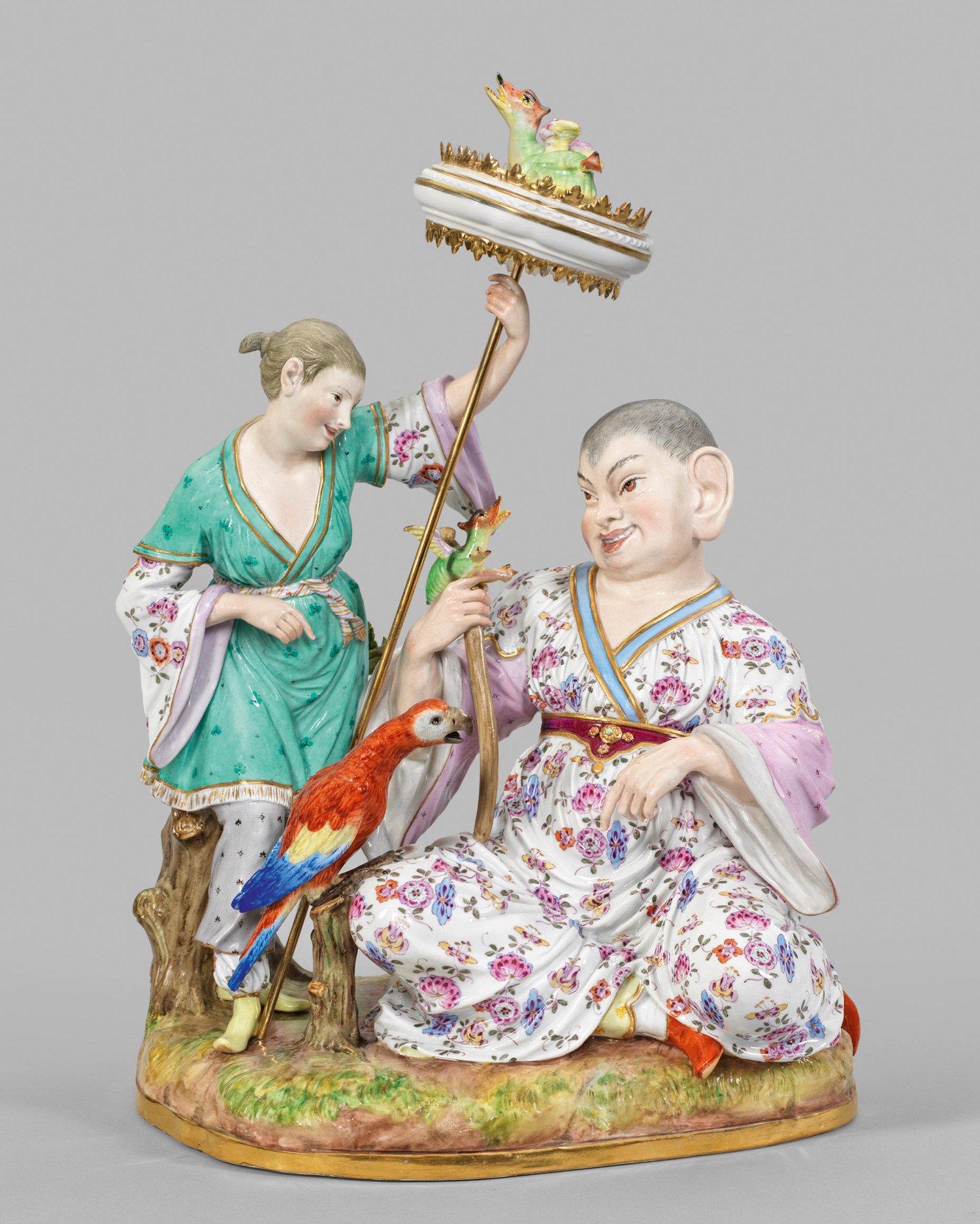 Auf naturalistisch gestaltetem Sockel sitzender Chinese in weißem, mit Indianischen Blumen gemustertem Gewand und schmuckbesetztem Gürtel, in der rechten Hand einen Stab mit plastischer Drachenbekrönung haltend. Seitlich stehende Dame in lavendelfarbener Hose mit seegrünem, blütengemustertem Gewand, dem Herrn mit großem Schirm Schatten spendend sowie ein sitzender Papagei auf Ast. Polychrome Malerei mit Goldstaffage. Entw. Johann Joachim Kaendler. Modell-Nr. 741. Minim. best./rest.; Schwertermarke. H. 33 cm.
