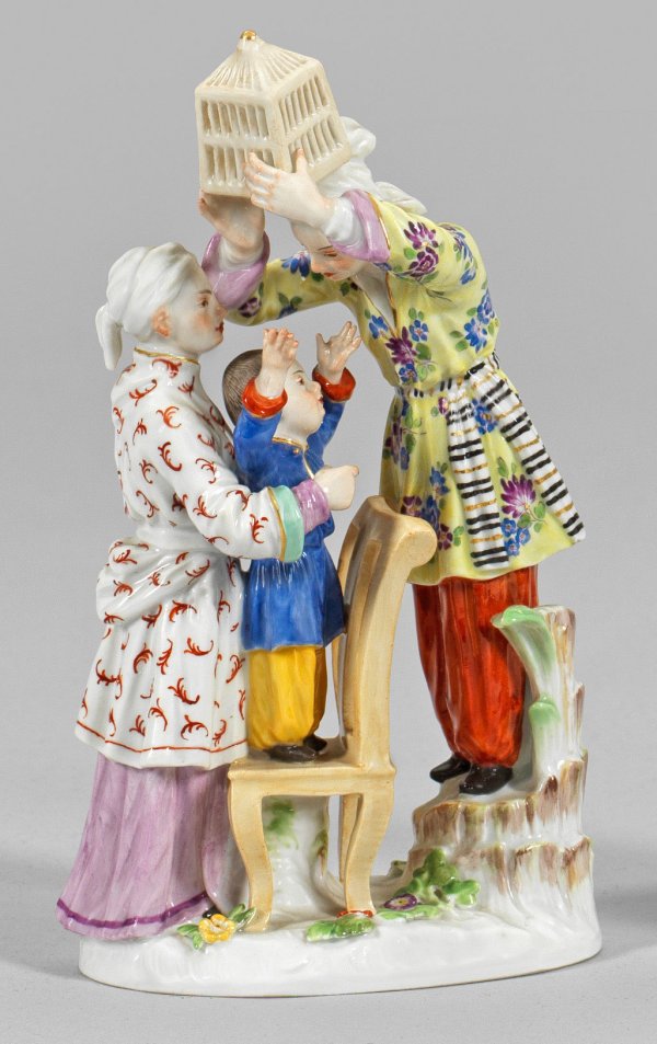 (bzw. Chinesengruppe). Auf einem Palmenstumpf erhöht stehende Chinesin, in ihren erhobenen Händen einen Vogelkäfig haltend. Vor ihr auf einem Stuhl stehendes, von einem älteren Mädchen gehaltenes Kind, mit emporstreckenden Armen nach dem Vogelbauer greifend. Polychrome Malerei mit Goldkonturierung. Entw. wohl Johann Joachim Kaendler oder Peter Reinicke. Modell-Nr. 2663. Minim. best.; Schwertermarke. H. 16 cm.