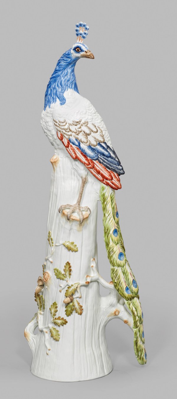 Auf hohem, von stark plastisch aufgelegtem Astwerk, Blättern und Eicheln umzogenem Baumstumpf majestätisch emporragende, vollplastisch gearbeitete Figur eines männlichen Pfaus mit herabhängendem Schweif, den erhobenen Kopf mit prächtiger Federkrone grazil zur Seite gewandt. Äußerst naturalistische Gestaltung nach Naturvorbild mit reliefplastischem Gefieder und akzentuierter, leuchtend blauer Staffierung des Halses und Kopfes, des Gefieders sowie der Schwanzfeder mit den charakteristischen "Augen". Polychrome Malerei. Entw. Johann Joachim Kaendler, 1734. Schwertermarke. H. 118 cm.