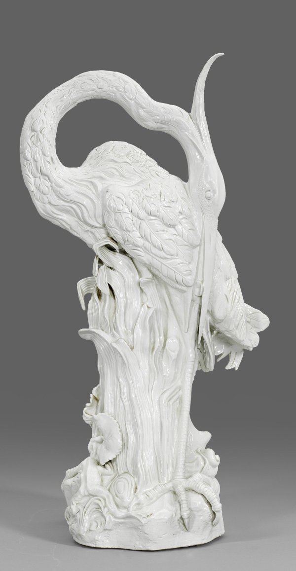 Weißporzellan. Über reliefplastischem Natursockel zwischen emporragendem Schilf stehender Fischreiher, sein Gefieder putzend. Der Hals in großem, geschweiften Bogen nach hinten geführt. Fein reliefiertes Federkleid. Entw. Johann Joachim Kaendler, 1732. Modell-Nr. 52. Jahreszeichen. Unw. Brandrisse. Eingepresste Weißwaren- und unterglasurblaue Schwertermarke. H. 76 cm.