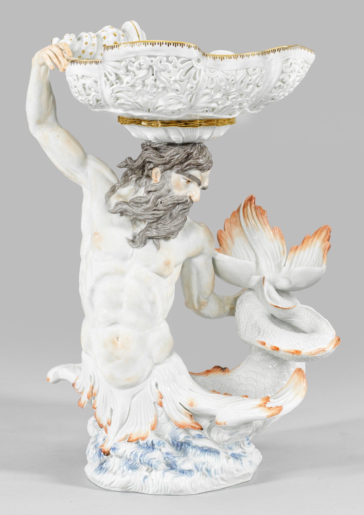 Über unregelmäßigem, stark reliefplastischem Wellensockel sich erhebender, vollplastisch gearbeiteter, bärtiger Meeresgott Glaukos mit langem, über die Schulter hängendem Haar und reliefartig geschupptem, sich spiralförmig emporwindendem Fischschwanz als Träger einer geschweiften Aufsatzschale. Muschelförmiger, floral durchbrochen gearbeiteter Korpus mit großer eingerollter Schnecke. Polychrome Malerei mit Goldstaffage. Gekämmte Goldkante. Entw. Johann Joachim Kaendler und Johann Friedrich Eberlein, 1738/1739. Modell-Nr. 80501. Schwertermarke. H. 47 cm.