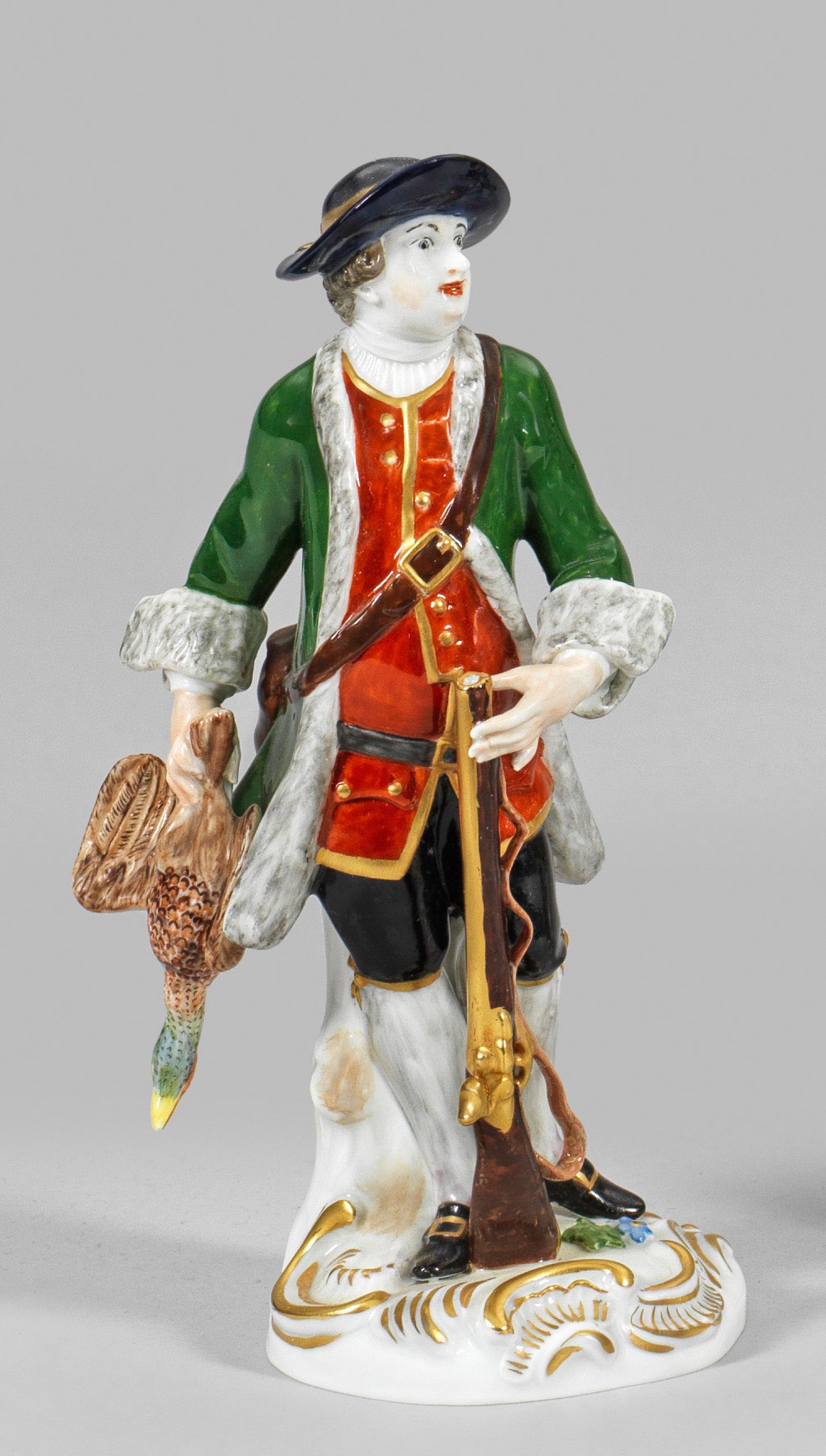 Auf rocaillereliefiertem Sockel stehender Jäger in tannengrünem Jagdrock, in der rechten Hand eine erlegte Gans haltend. Mit der Linken die auf dem Boden abgestützte Flinte haltend. Polychrome Malerei mit Goldstaffage. Modell-Nr. 63047. Unw. rest.; Schwertermarke. H. 16 cm.