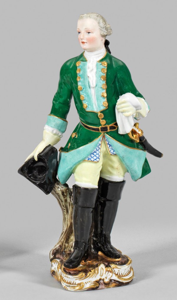 Auf rocaillereliefiertem Sockel stehender Falkner in tannengrünem Rock, in den Händen einen Dreizack bzw. ein Tuch haltend. Polychrome Malerei mit Goldstaffage. Entw. Johann Friedrich Eberlein. Modell-Nr. 512. Rest.; Schwertermarke. H. 18 cm.