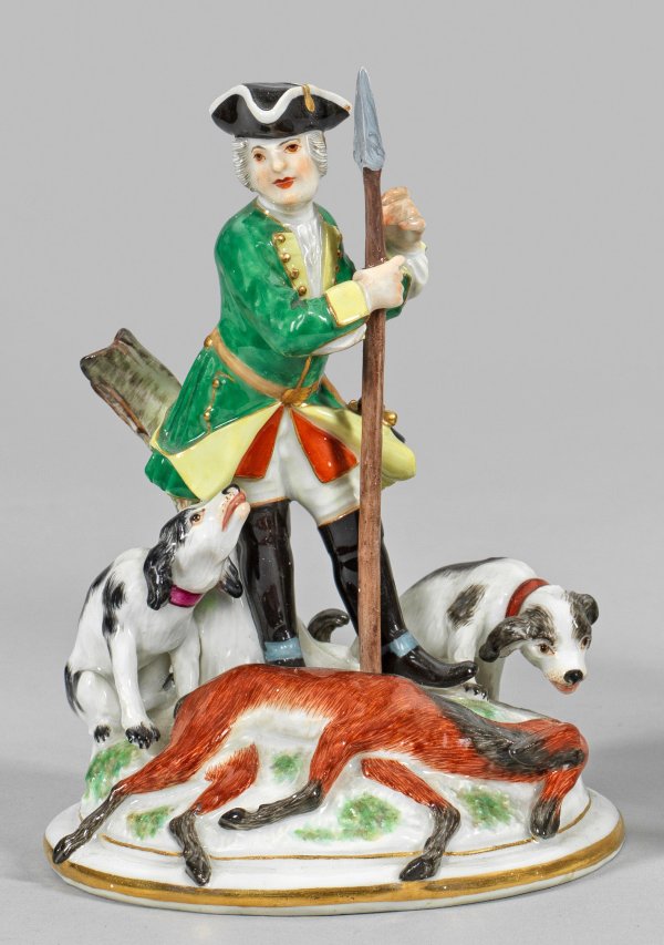 Auf gewölbtem Sockel stehender Jäger in grünem, gelb abgesetztem Jagdrock mit Dreispitz, umgeben von zwei Hunden, in der rechten Hand einen Speer haltend. Zu den Füßen liegendes, erlegtes Reh. Polychrome Malerei mit Goldstaffage. Entw. Johann Gottlieb Ehder. Modell-Nr. 223. Jahreszeichen. Minim. rest.; Schwertermarke. H. 15 cm.