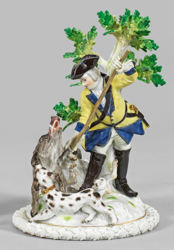 sog. "Fangstoßgruppe". Auf rundem, von plastischem Eichenlaub bekränztem Sockel stehender, von Jagdhunden umringter Parforcejäger in gelb-blauem, sächsischem Livree mit Dreispitz, ein Wildschwein erlegend. Entw. Johann Joachim Kaendler. Modell-Nr. 220. Rest.; Schwertermarke. H. 20,5 cm.