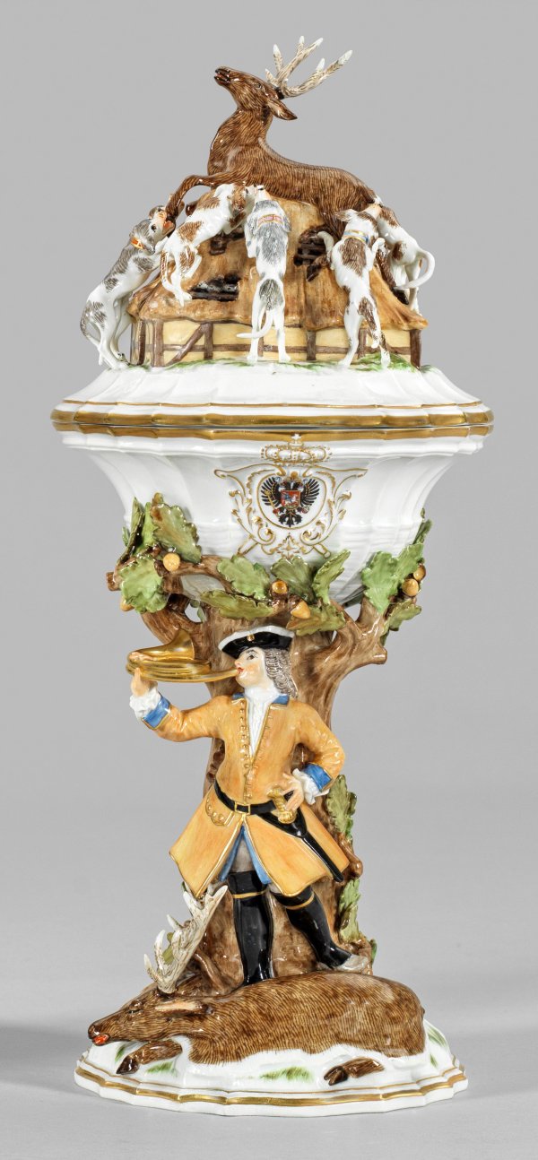 Über mehrpassigem Natursockel aufsteigender, mit plastischem Blattwerk und Früchten belegter Eichenbaumschaft als Träger für eine runde, muschelreliefierte Schale mit korrespondierendem Deckel. Als Bekrönung die vollplastische, szenische Darstellung eines, von einer Hundemeute umringten, auf einem Stalldach liegenden Rothirsches. Schauseitig ein das Jagdhorn blasender Jäger in ockerfarbenem Rock. Nach einer Zeichnung von Johann Conrad Schlaun. Beidseitig der Wandung bekrönte Kartusche mit russischem Wappen bzw. Jagdemblem. Polychrome Malerei mit reicher Goldstaffage. Entw. Johann Joachim Kaendler und Johann Gottlieb Ehder, 1741. Modell-Nr. 267. Partiell rest.; Schwertermarke. H. 36 cm.