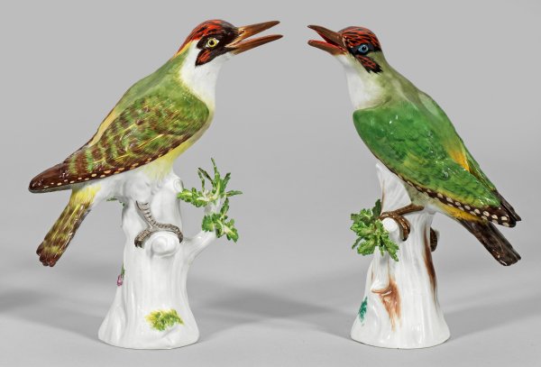 Auf hohem Baumstammsockel mit plastischem Laubwerk jeweils ein sitzender Grünspecht mit farbenprächtigem, fein reliefiertem Gefieder. Polychrome Malerei. Entw. Johann Joachim Kaendler. Modell-Nr. 56, 77033. Partiell rest.; Schwertermarke. H. 26 cm - 27 cm.