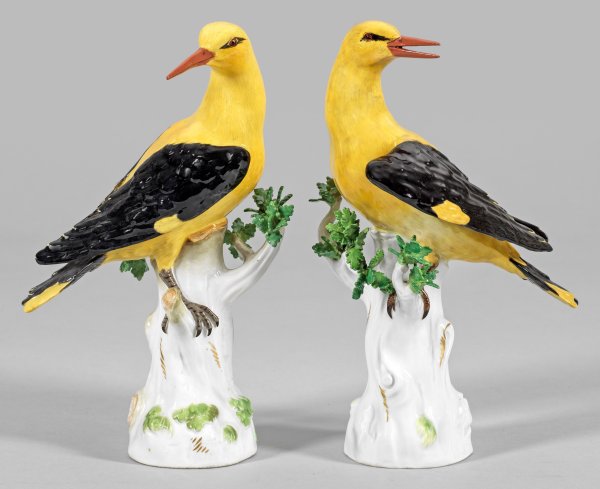 Auf hohem, mit plastischen Blättern belegtem Eichenbaumstamm sitzender Pirol mit angelegten bzw. ausgebreiteten Flügeln. Naturalistisches, in Gelb und Schwarz staffiertes, teilw. reliefiertes Gefieder. Polychrome Malerei. Entw. Johann Joachim Kaendler und Johann Gottlieb Ehder. Modell-Nr. 820 und 820x. Rest.; Schwertermarke. H. 25,5 cm.