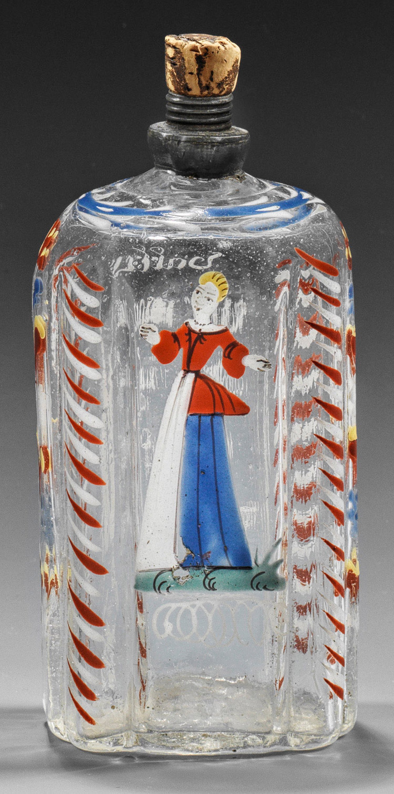 Farbloses, leicht graustichiges Glas mit Abriss im Boden. Querrechteckige Form mit abgeschrägten Ecken, gerundeter Schulter und zinnmontierter Mündung. Polychromer floraler Dekor in opaker Emailmalerei. Schauseitig tanzende Dame in langem Kleid, rücks. Inschrift "(...) ein man oder ich lauff dar von". Seitlich stilisiertes Blattwerk. H. 14,5 cm.