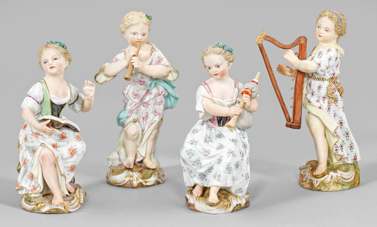 Auf rocaillereliefiertem, goldgehöhtem Sockel sitzende bzw. stehende Sängerin, Dudelsackspielerin, Klarinettistin und Harfenistin in geblümter Kleidung. Polychrome Malerei mit Goldstaffage. Johann Joachim Kaendler. Modell-Nr. 2550, 2558, 2566, 2567. Teilw. Brandrisse/rest./minim. best.; Schwertermarke. H. 12,5 cm - 14 cm.