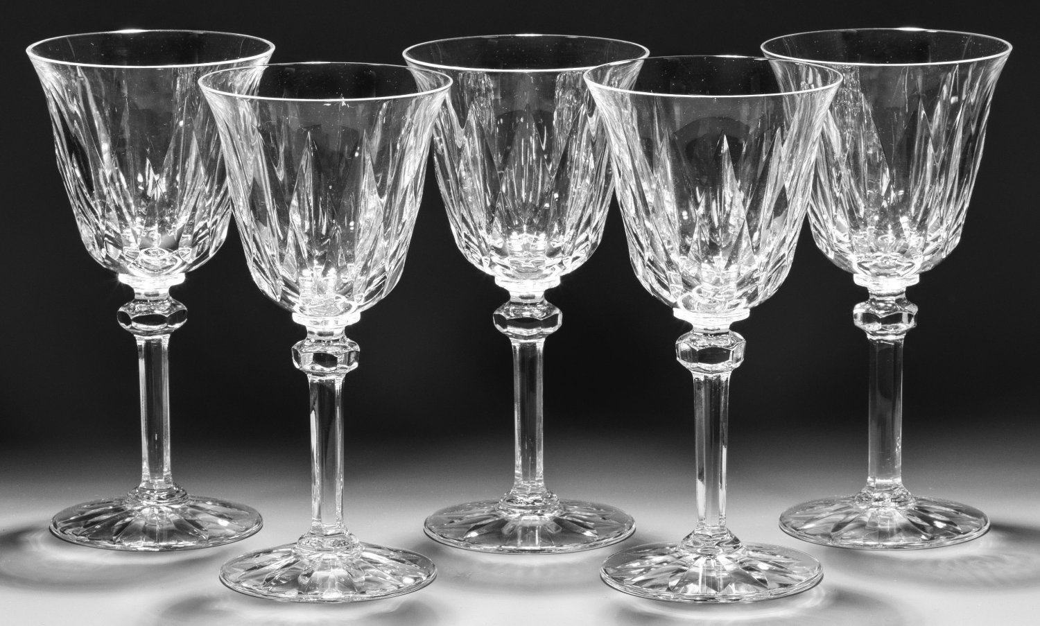 Farbloses Kristallglas, geschliffen und poliert. Leicht ansteigender Scheibenfuß mit Bodenstern, sechsfach geschälter Schaft mit flachem Nodus, die glockenförmige Kuppa mit ornamentalem Schliff. Entw. 1969. Vier Gläser mit Firmen-Ätzstempel. H. 17 cm.